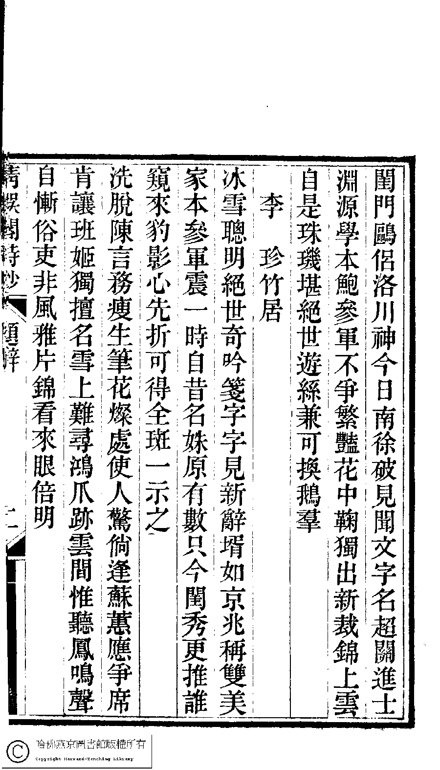 | (PRINT FRIENDLY VERSION) 京江鮑氏三女史詩鈔合刻(清戴燮元輯) : 清娛閣詩鈔。清光緖八年(1882) 刻本。 ![]() Page : 題辭.2b | click for larger image | 京江鮑氏三女史詩鈔合刻(清戴燮元輯) : 清娛閣詩鈔。清光緖八年(1882) 刻本。![]() Page : 題辭.2a | click for larger image | Back |