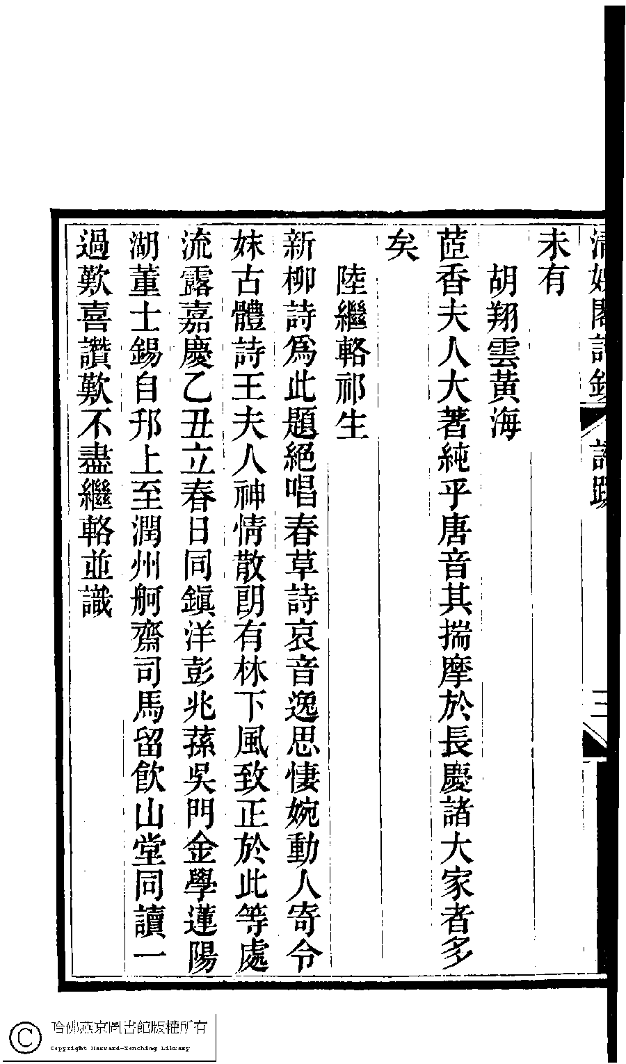 | (PRINT FRIENDLY VERSION) 京江鮑氏三女史詩鈔合刻(清戴燮元輯) : 清娛閣詩鈔。清光緖八年(1882) 刻本。 ![]() Page : 評跋.3b | click for larger image | Back |