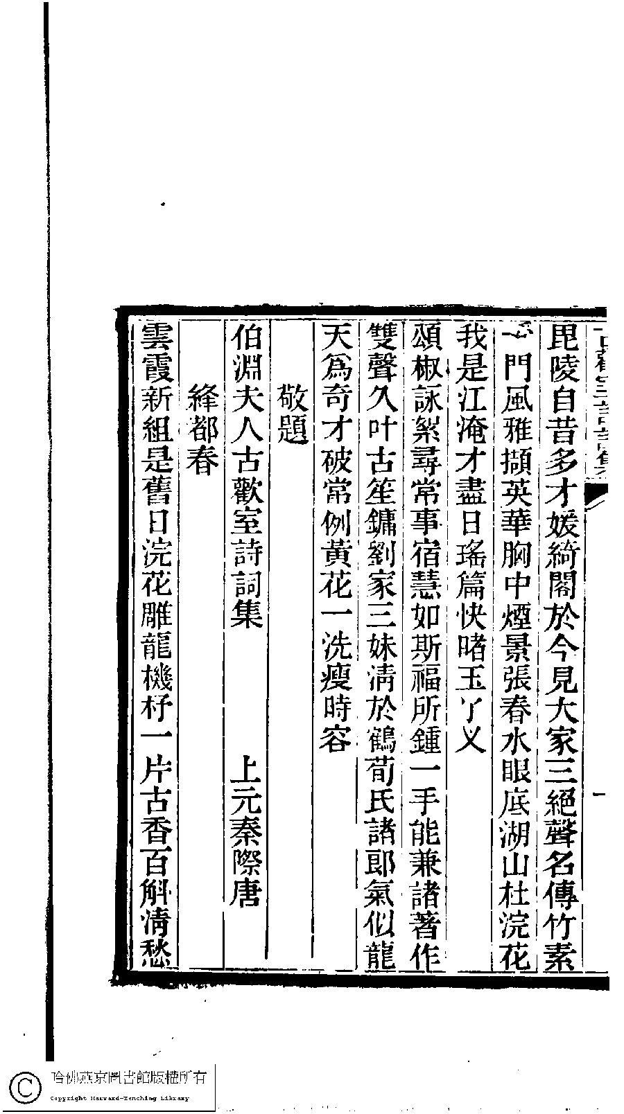 | (PRINT FRIENDLY VERSION) 古歡室集:詩三卷,詞一卷,醫學篇二卷,女學篇一卷,中饋錄一卷(清曽懿撰)。清光緖三十三年(1907)刻本。 ![]() Page : 題辭.2a | click for larger image | 古歡室集:詩三卷,詞一卷,醫學篇二卷,女學篇一卷,中饋錄一卷(清曽懿撰)。清光緖三十三年(1907)刻本。![]() Page : 題辭.1b | click for larger image | Back |
