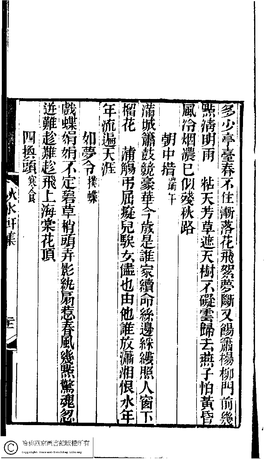 | (PRINT FRIENDLY VERSION) 林下雅音集﹕五種(淸冒俊輯) : 秋水軒詩詞集: 一卷。淸光緖十年(1884)刻本。 ![]() Page : 詞.21a | click for larger image | Back |