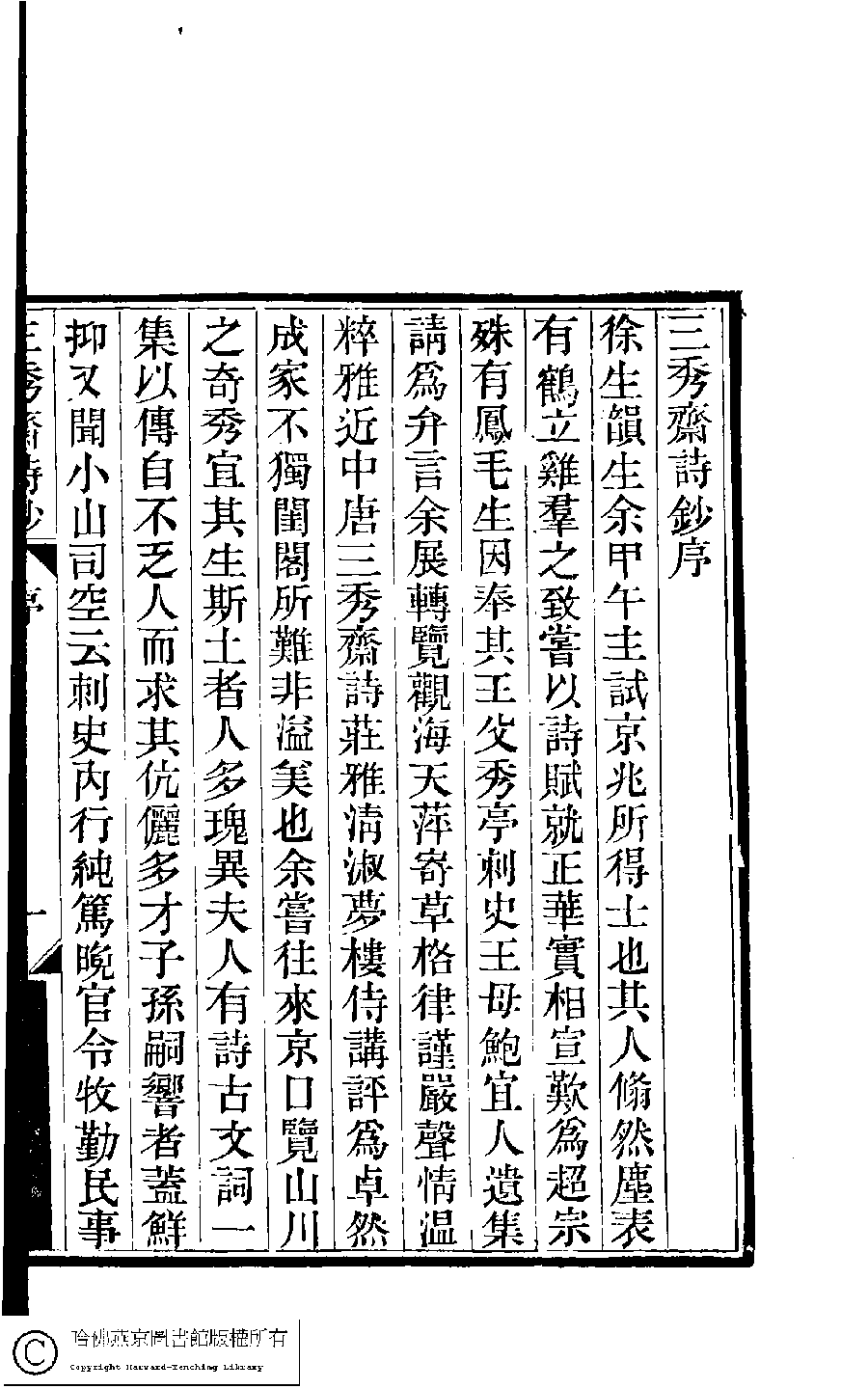 | (PRINT FRIENDLY VERSION) 京江鮑氏三女史詩鈔合刻(清戴燮元輯) : 三秀齋詩鈔。清光緖八年(1882) 刻本。 ![]() Page : 序.1b | click for larger image | 京江鮑氏三女史詩鈔合刻(清戴燮元輯) : 三秀齋詩鈔。清光緖八年(1882) 刻本。![]() Page : 序.1a | click for larger image | Back |