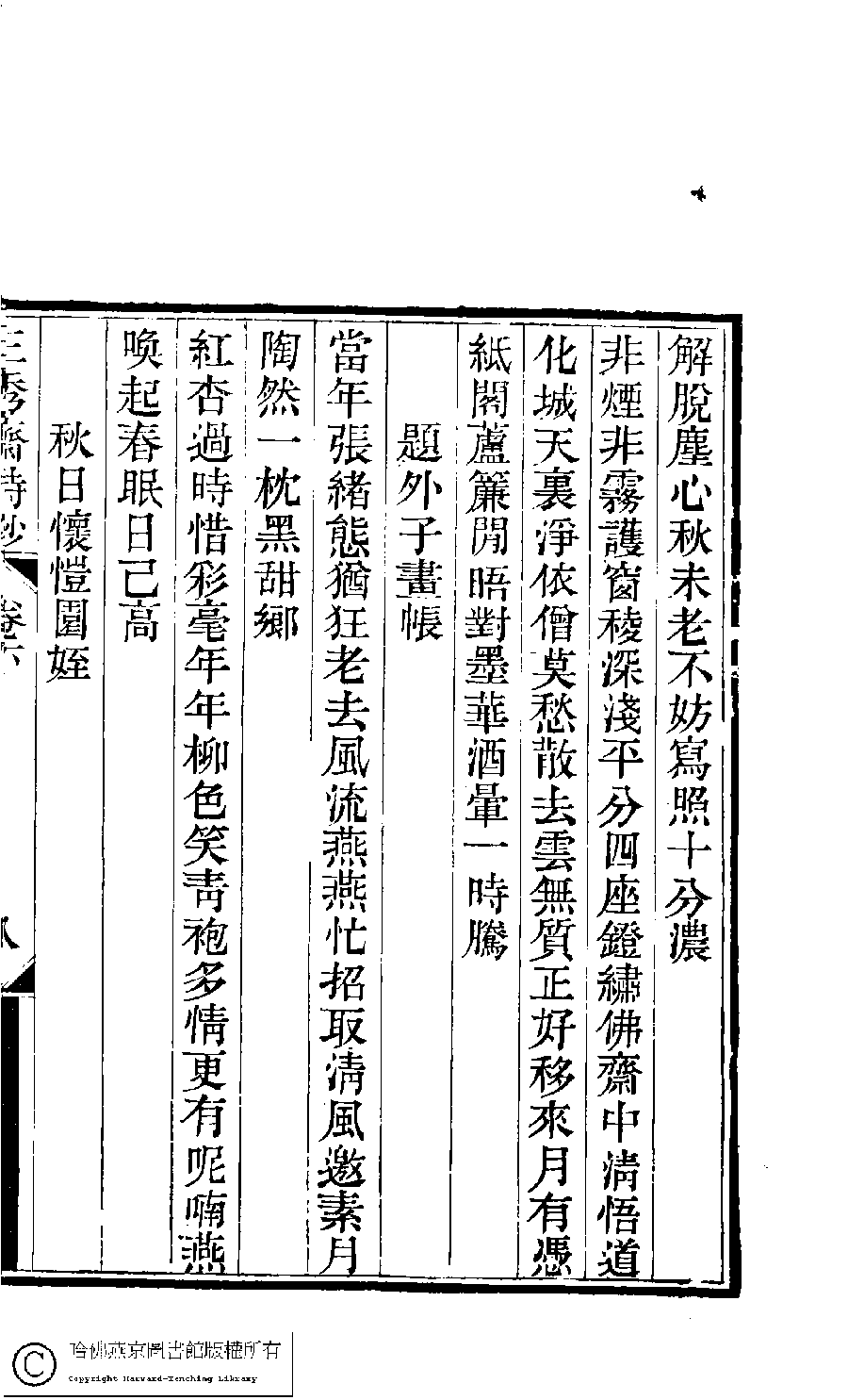 | (PRINT FRIENDLY VERSION) 京江鮑氏三女史詩鈔合刻(清戴燮元輯) : 三秀齋詩鈔。清光緖八年(1882) 刻本。 ![]() Page : 2.8a | click for larger image | 京江鮑氏三女史詩鈔合刻(清戴燮元輯) : 三秀齋詩鈔。清光緖八年(1882) 刻本。![]() Page : 2.7b | click for larger image | Back |