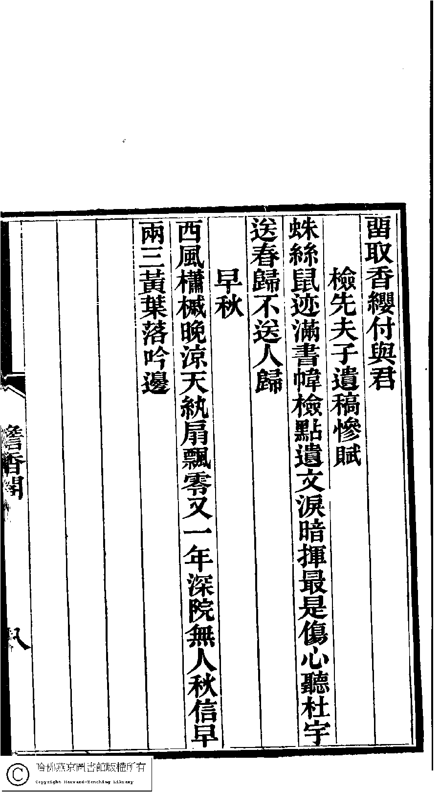 | (PRINT FRIENDLY VERSION) 澹香閣詩鈔:一卷外四種(清李星池等撰) : 澹香閣詩鈔﹕一卷(清李星池撰)。清光緖四年(1878)刻本。 ![]() Page : 1.8b | click for larger image | 澹香閣詩鈔:一卷外四種(清李星池等撰) : 澹香閣詩鈔﹕一卷(清李星池撰)。清光緖四年(1878)刻本。![]() Page : 1.8a | click for larger image | Back |