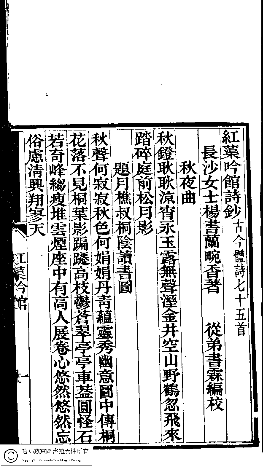 | (PRINT FRIENDLY VERSION) 澹香閣詩鈔:一卷外四種(清李星池等撰) : 紅蕖吟館詩鈔﹕一卷(清楊書蘭撰)。清光緖四年(1878)刻本。 ![]() Page : 2.1a | click for larger image | Back |