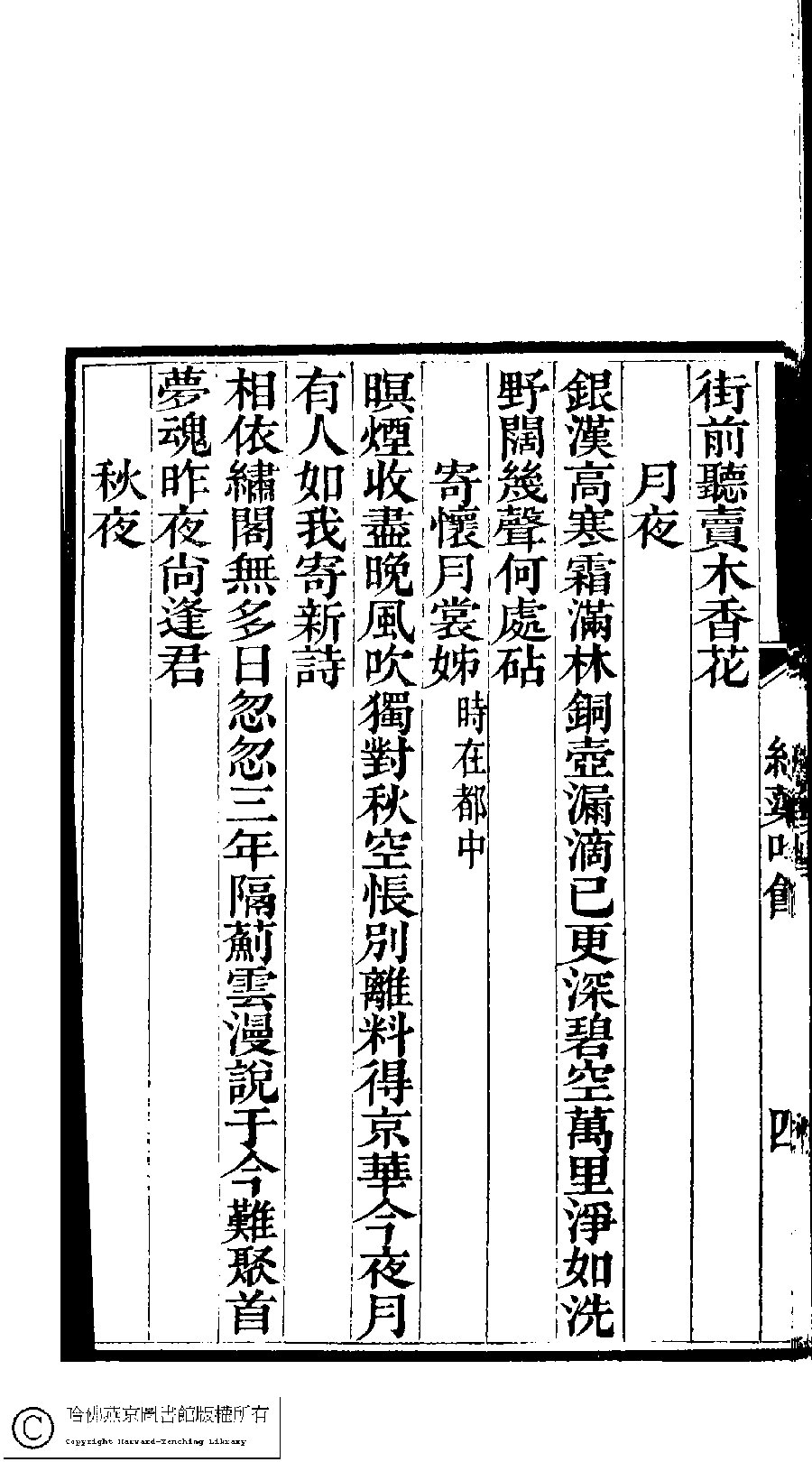 | (PRINT FRIENDLY VERSION) 澹香閣詩鈔:一卷外四種(清李星池等撰) : 紅蕖吟館詩鈔﹕一卷(清楊書蘭撰)。清光緖四年(1878)刻本。 ![]() Page : 2.4b | click for larger image | Back |