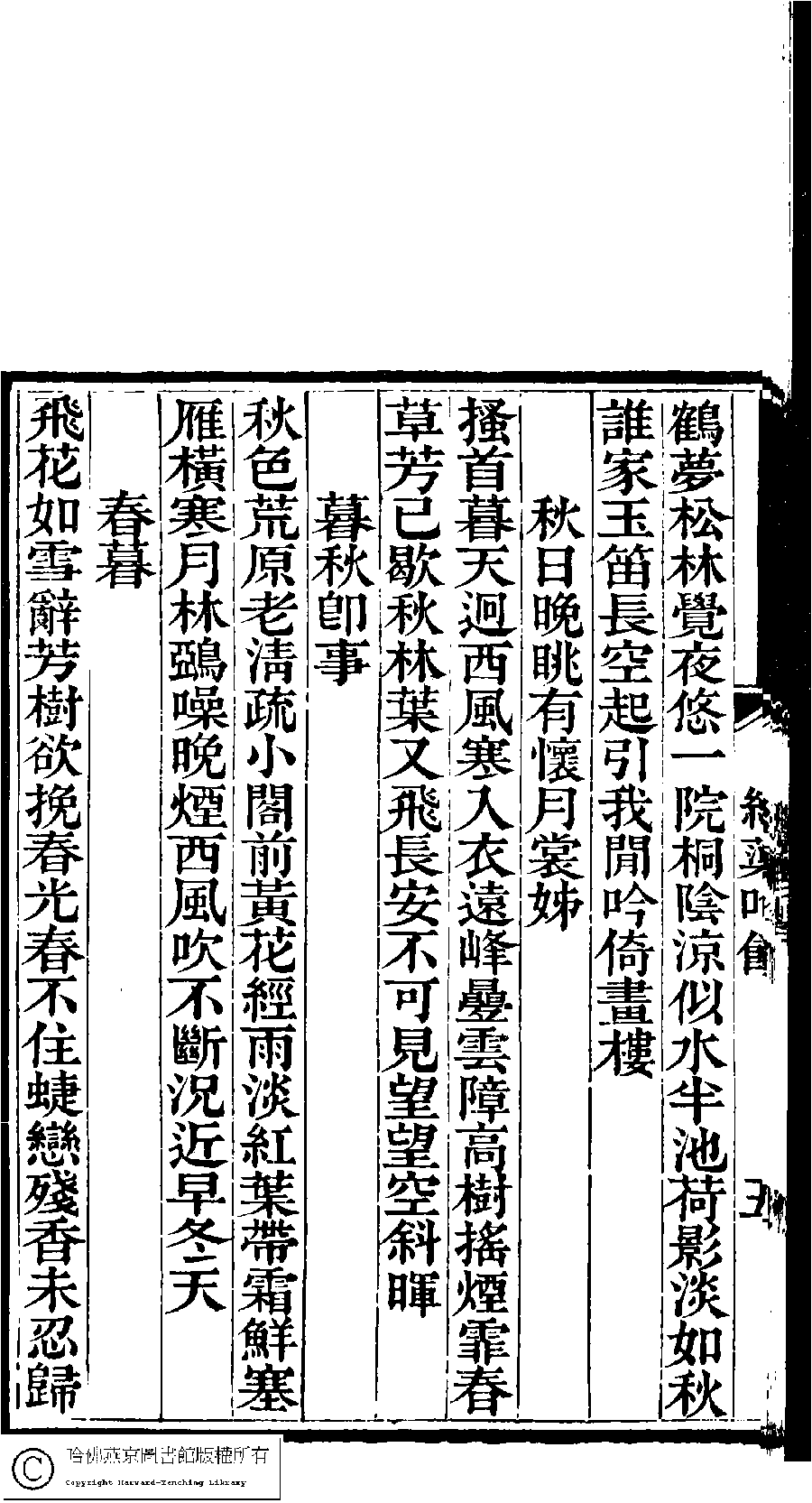 | (PRINT FRIENDLY VERSION) 澹香閣詩鈔:一卷外四種(清李星池等撰) : 紅蕖吟館詩鈔﹕一卷(清楊書蘭撰)。清光緖四年(1878)刻本。 ![]() Page : 2.6a | click for larger image | 澹香閣詩鈔:一卷外四種(清李星池等撰) : 紅蕖吟館詩鈔﹕一卷(清楊書蘭撰)。清光緖四年(1878)刻本。![]() Page : 2.5b | click for larger image | Back |
