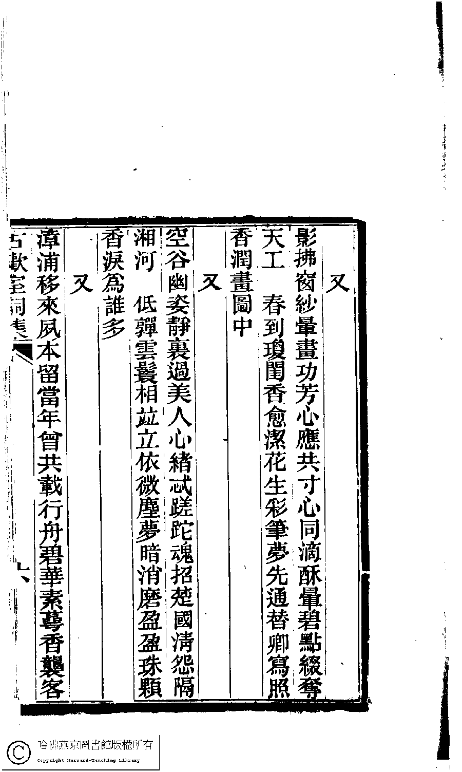 | (PRINT FRIENDLY VERSION) 古歡室集:詩三卷,詞一卷,醫學篇二卷,女學篇一卷,中饋錄一卷(清曽懿撰)。清光緖三十三年(1907)刻本。 ![]() Page : 詞.6b | click for larger image | 古歡室集:詩三卷,詞一卷,醫學篇二卷,女學篇一卷,中饋錄一卷(清曽懿撰)。清光緖三十三年(1907)刻本。![]() Page : 詞.6a | click for larger image | 古歡室集:詩三卷,詞一卷,醫學篇二卷,女學篇一卷,中饋錄一卷(清曽懿撰)。清光緖三十三年(1907)刻本。![]() Page : 詞.5b | click for larger image | Back |