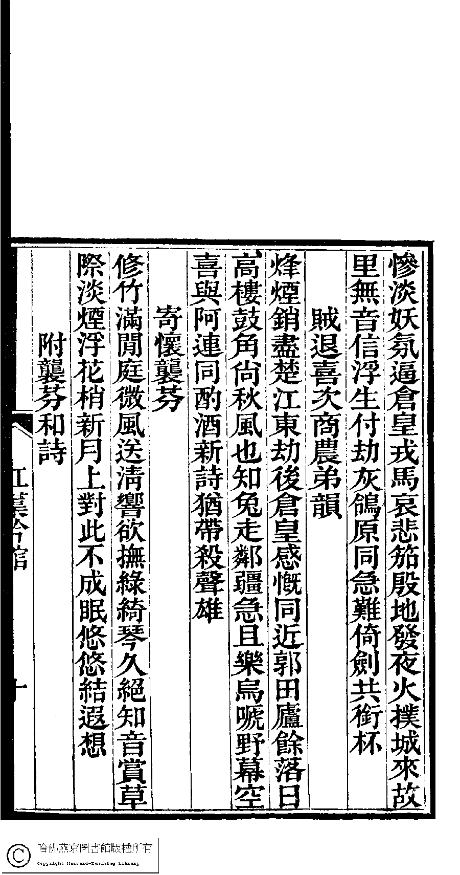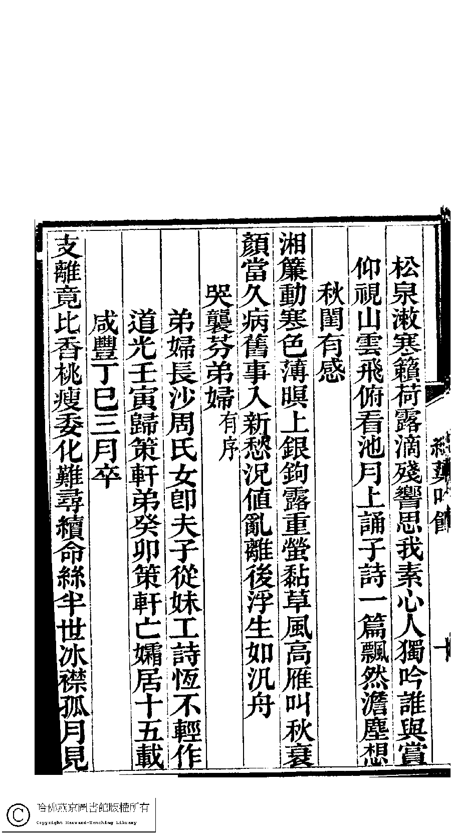 | (PRINT FRIENDLY VERSION) 澹香閣詩鈔:一卷外四種(清李星池等撰) : 紅蕖吟館詩鈔﹕一卷(清楊書蘭撰)。清光緖四年(1878)刻本。 ![]() Page : 2.10b | click for larger image | 澹香閣詩鈔:一卷外四種(清李星池等撰) : 紅蕖吟館詩鈔﹕一卷(清楊書蘭撰)。清光緖四年(1878)刻本。![]() Page : 2.10a | click for larger image | Back |
