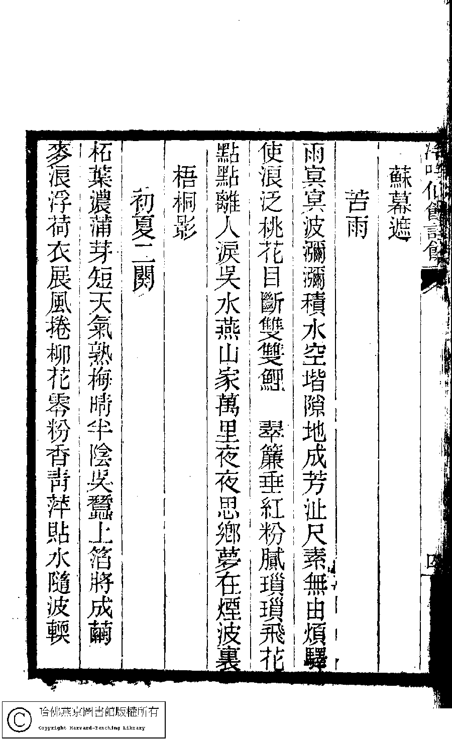 | (PRINT FRIENDLY VERSION) 冷吟仙舘詩稿﹕八卷﹐詩餘一卷﹐文存一卷(淸左錫嘉撰)。淸光緖辛卯(1891)刻本。 ![]() Page : 詩餘.4b | click for larger image | Back |