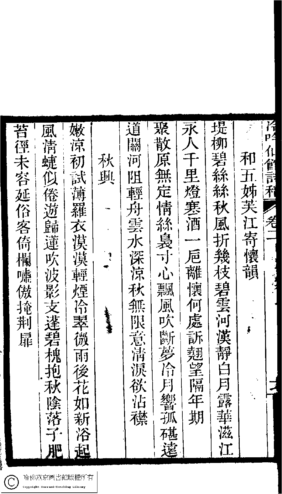 | (PRINT FRIENDLY VERSION) 冷吟仙舘詩稿﹕八卷﹐詩餘一卷﹐文存一卷(淸左錫嘉撰)。淸光緖辛卯(1891)刻本。 ![]() Page : 2.17b | click for larger image | Back |