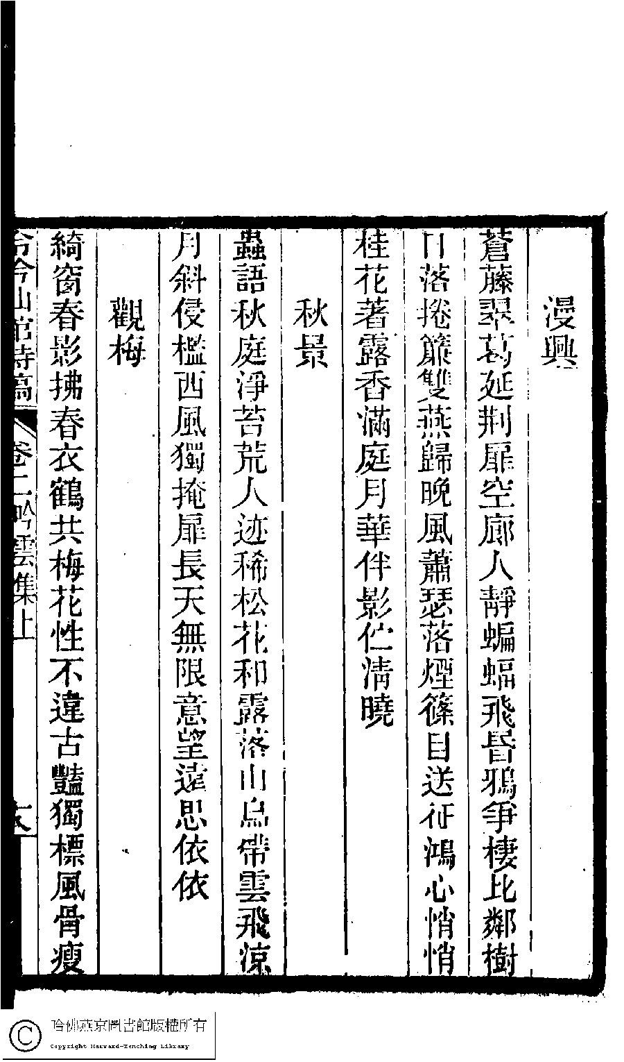 | (PRINT FRIENDLY VERSION) 冷吟仙舘詩稿﹕八卷﹐詩餘一卷﹐文存一卷(淸左錫嘉撰)。淸光緖辛卯(1891)刻本。 ![]() Page : 2.18a | click for larger image | Back |