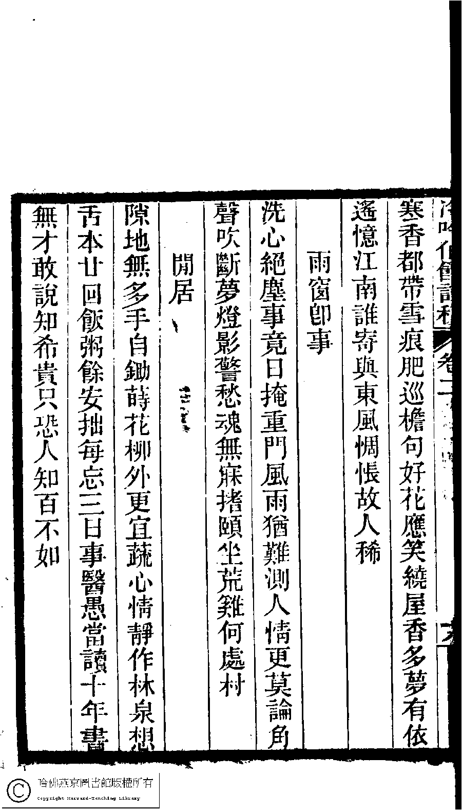 | (PRINT FRIENDLY VERSION) 冷吟仙舘詩稿﹕八卷﹐詩餘一卷﹐文存一卷(淸左錫嘉撰)。淸光緖辛卯(1891)刻本。 ![]() Page : 2.18b | click for larger image | Back |
