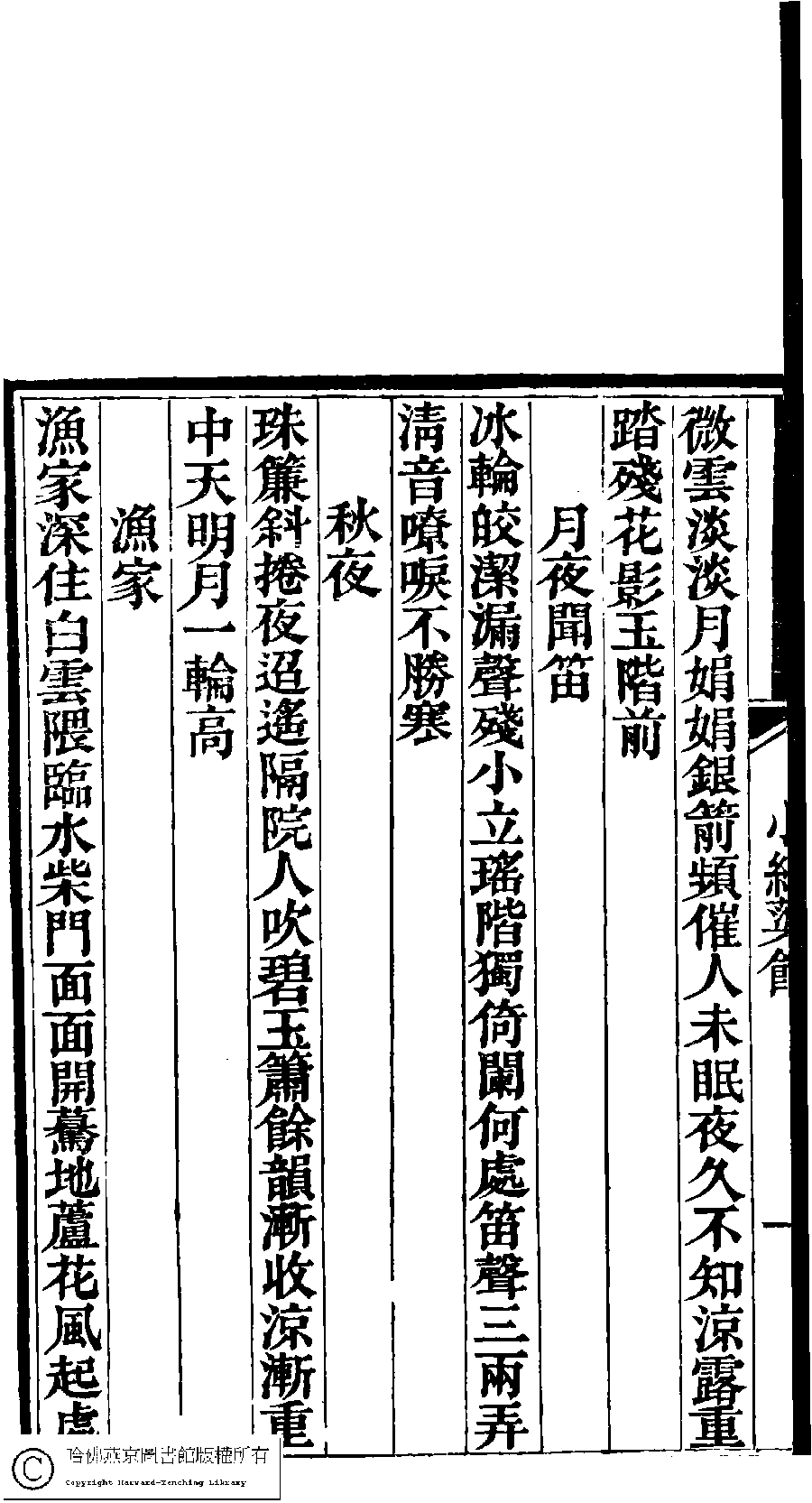 | (PRINT FRIENDLY VERSION) 澹香閣詩鈔:一卷外四種(清李星池等撰) : 小紅蕖館詩﹕一卷(清周傳鏡撰)。清光緖四年(1878)刻本。 ![]() Page : 4.1b | click for larger image | Back |