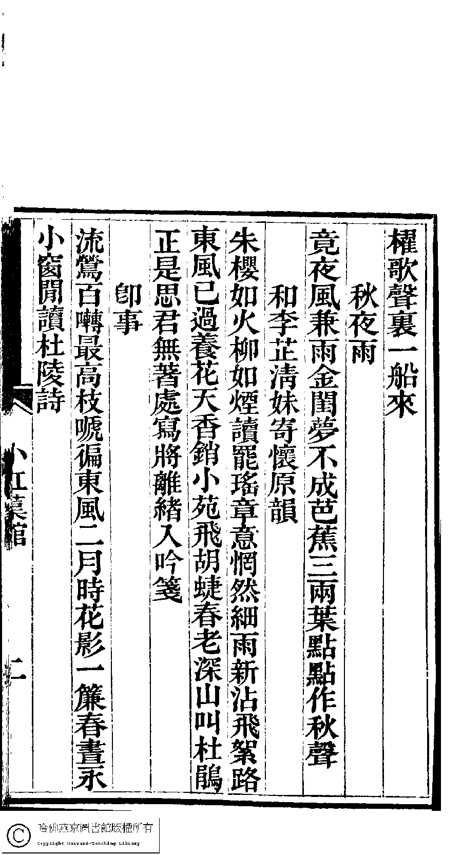 | (PRINT FRIENDLY VERSION) 澹香閣詩鈔:一卷外四種(清李星池等撰) : 小紅蕖館詩﹕一卷(清周傳鏡撰)。清光緖四年(1878)刻本。 ![]() Page : 4.2a | click for larger image | Back |