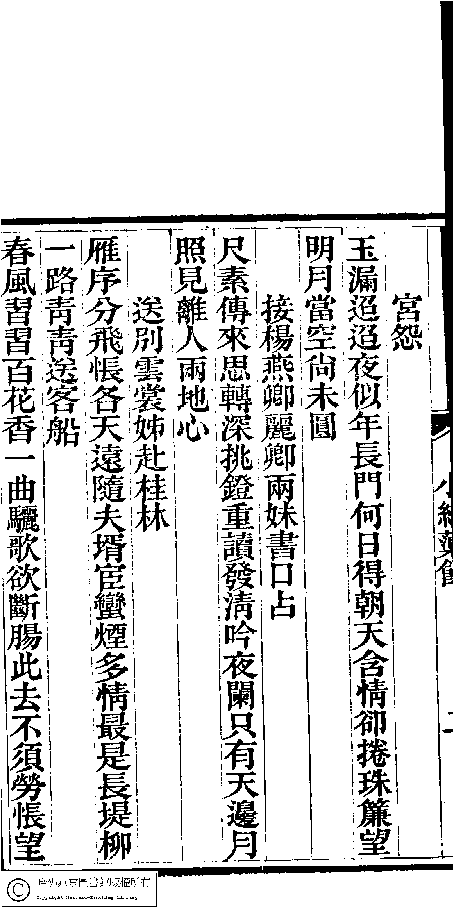 | Appears in: Dan xiang ge shi chao: 1 juan wai 4 zhong (by Li Xingchi etc., Qing dynasty): Xiao hong qu guan shi: 1 juan (by Zhou Chuanjing, Qing dynasty) |