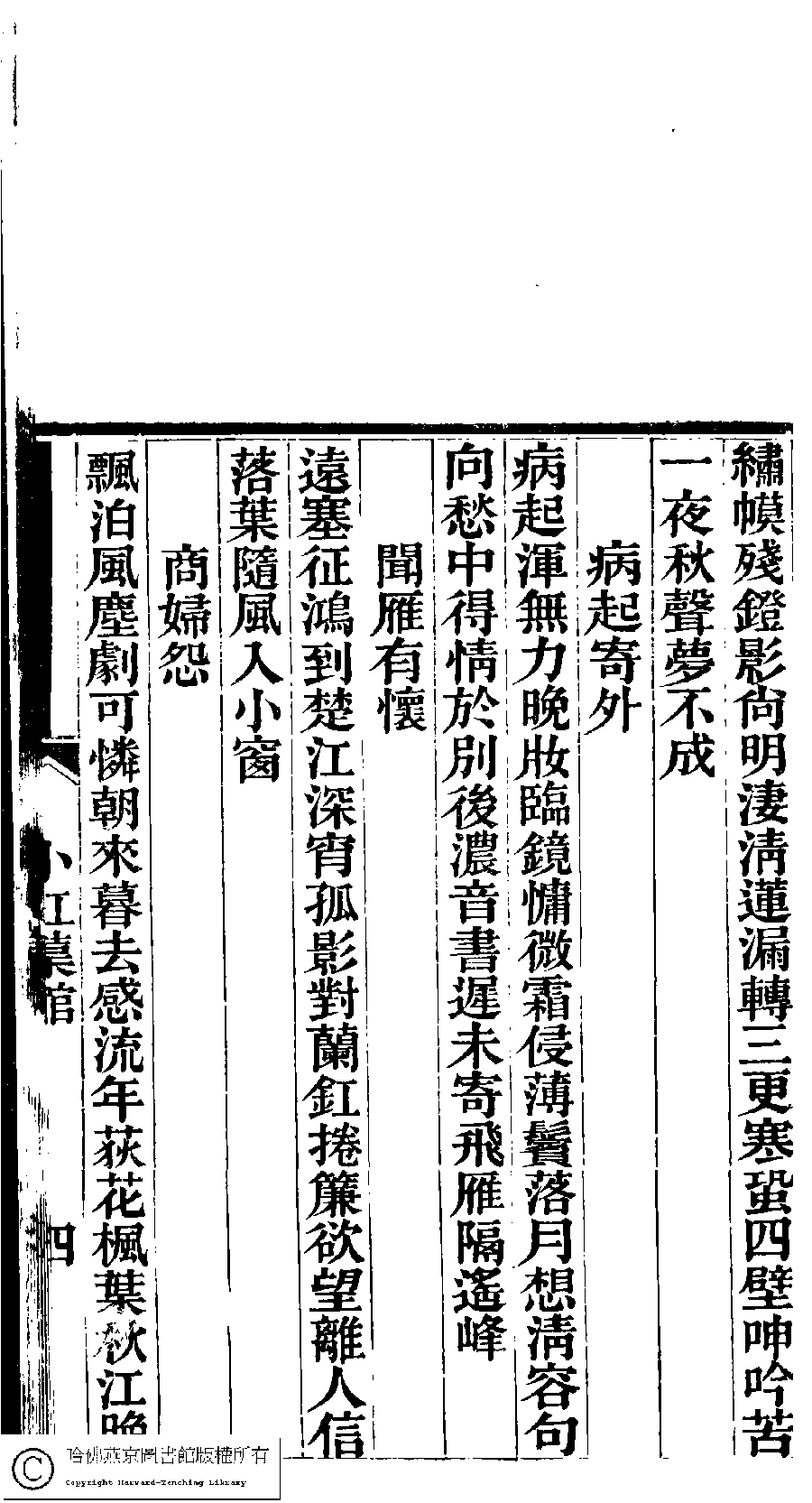 | (PRINT FRIENDLY VERSION) 澹香閣詩鈔:一卷外四種(清李星池等撰) : 小紅蕖館詩﹕一卷(清周傳鏡撰)。清光緖四年(1878)刻本。 ![]() Page : 4.4a | click for larger image | Back |