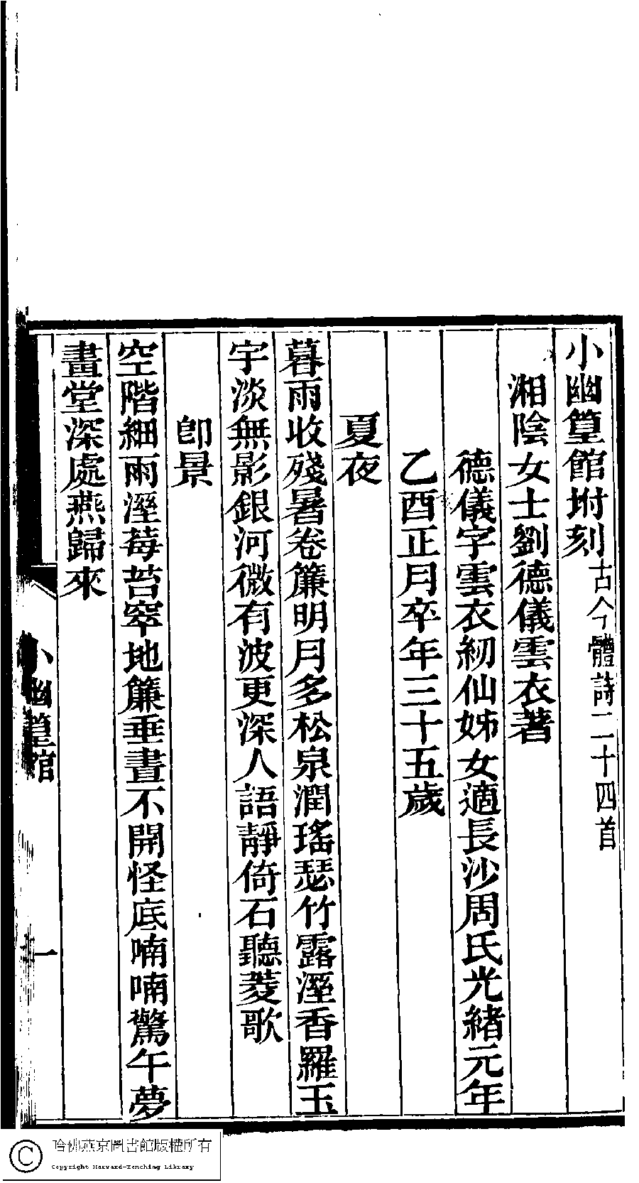 | (PRINT FRIENDLY VERSION) 澹香閣詩鈔:一卷外四種(清李星池等撰) : 小幽篁館詩﹕一卷(清劉德儀撰)。清光緖四年(1878)刻本。 ![]() Page : 5.1a | click for larger image | Back |