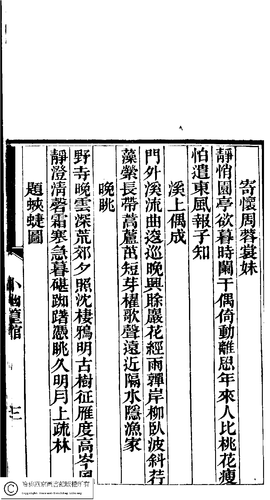 | (PRINT FRIENDLY VERSION) 澹香閣詩鈔:一卷外四種(清李星池等撰) : 小幽篁館詩﹕一卷(清劉德儀撰)。清光緖四年(1878)刻本。 ![]() Page : 5.3a | click for larger image | Back |