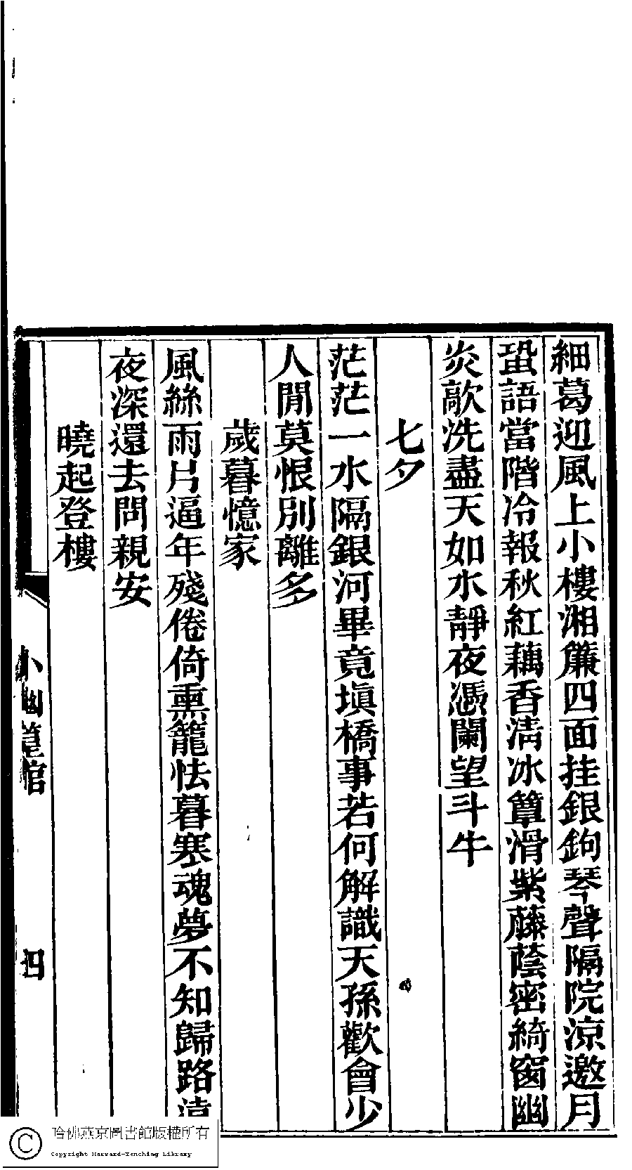 | (PRINT FRIENDLY VERSION) 澹香閣詩鈔:一卷外四種(清李星池等撰) : 小幽篁館詩﹕一卷(清劉德儀撰)。清光緖四年(1878)刻本。 ![]() Page : 5.4a | click for larger image | Back |