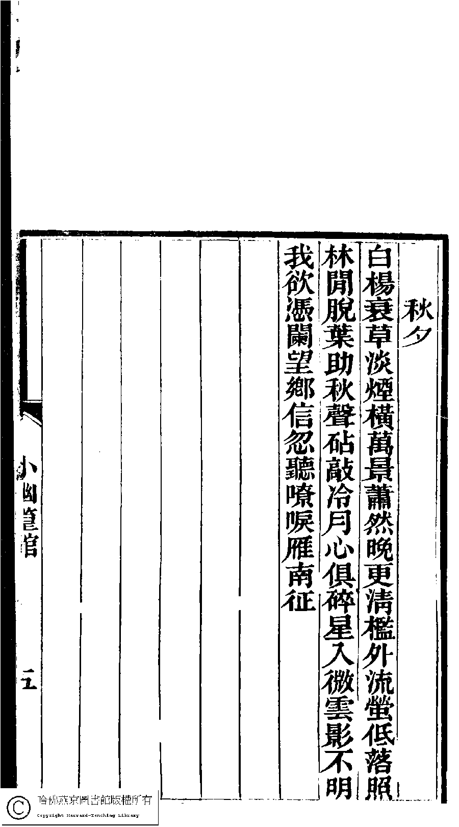 | (PRINT FRIENDLY VERSION) 澹香閣詩鈔:一卷外四種(清李星池等撰) : 小幽篁館詩﹕一卷(清劉德儀撰)。清光緖四年(1878)刻本。 ![]() Page : 5.5b | click for larger image | 澹香閣詩鈔:一卷外四種(清李星池等撰) : 小幽篁館詩﹕一卷(清劉德儀撰)。清光緖四年(1878)刻本。![]() Page : 5.5a | click for larger image | Back |
