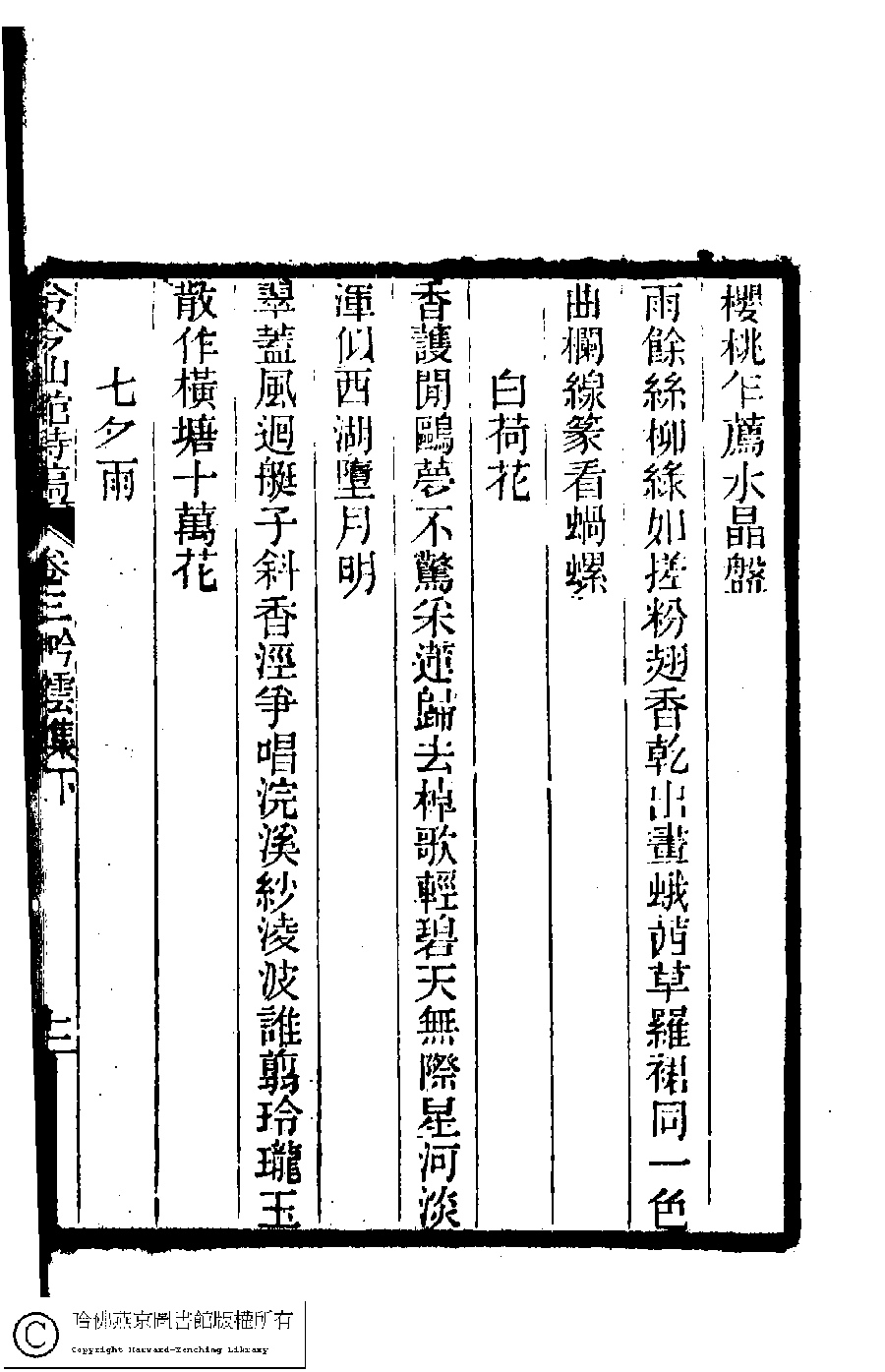 | (PRINT FRIENDLY VERSION) 冷吟仙舘詩稿﹕八卷﹐詩餘一卷﹐文存一卷(淸左錫嘉撰)。淸光緖辛卯(1891)刻本。 ![]() Page : 3.11a | click for larger image | Back |
