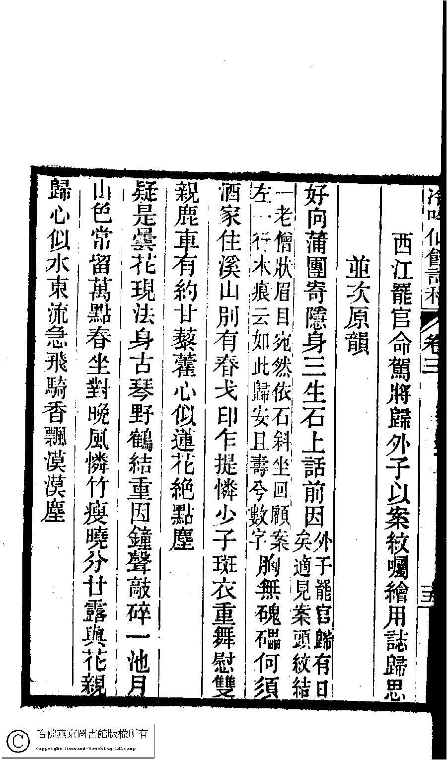 | (PRINT FRIENDLY VERSION) 冷吟仙舘詩稿﹕八卷﹐詩餘一卷﹐文存一卷(淸左錫嘉撰)。淸光緖辛卯(1891)刻本。 ![]() Page : 3.15b | click for larger image | Back |