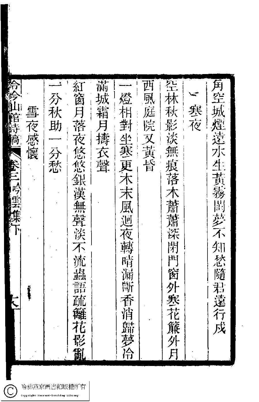 | (PRINT FRIENDLY VERSION) 冷吟仙舘詩稿﹕八卷﹐詩餘一卷﹐文存一卷(淸左錫嘉撰)。淸光緖辛卯(1891)刻本。 ![]() Page : 3.18a | click for larger image | 冷吟仙舘詩稿﹕八卷﹐詩餘一卷﹐文存一卷(淸左錫嘉撰)。淸光緖辛卯(1891)刻本。![]() Page : 3.17b | click for larger image | Back |