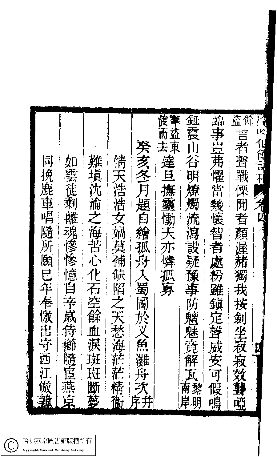 | (PRINT FRIENDLY VERSION) 冷吟仙舘詩稿﹕八卷﹐詩餘一卷﹐文存一卷(淸左錫嘉撰)。淸光緖辛卯(1891)刻本。 ![]() Page : 4.4b | click for larger image | 冷吟仙舘詩稿﹕八卷﹐詩餘一卷﹐文存一卷(淸左錫嘉撰)。淸光緖辛卯(1891)刻本。![]() Page : 4.4a | click for larger image | Back |