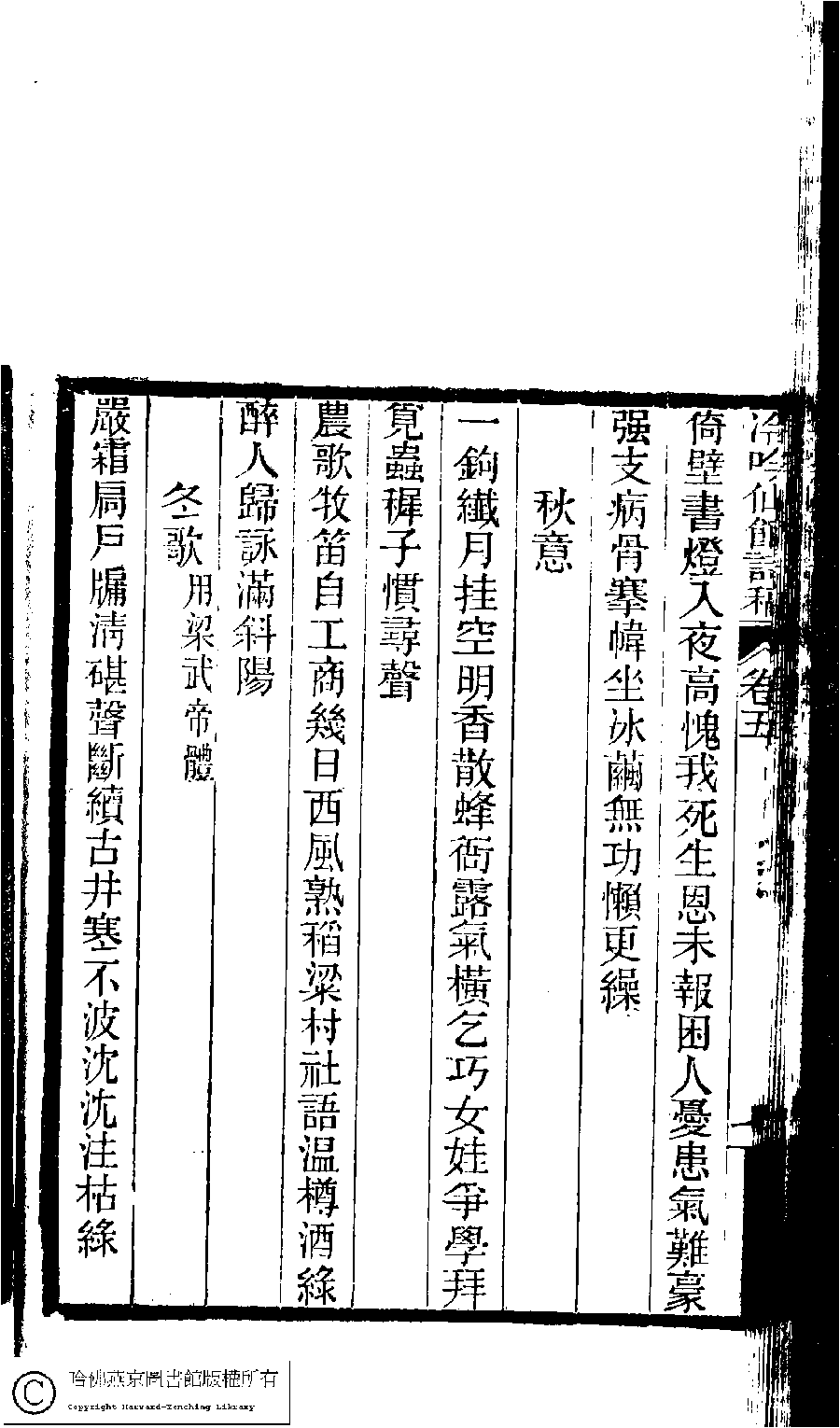 | (PRINT FRIENDLY VERSION) 冷吟仙舘詩稿﹕八卷﹐詩餘一卷﹐文存一卷(淸左錫嘉撰)。淸光緖辛卯(1891)刻本。 ![]() Page : 5.7b | click for larger image | Back |