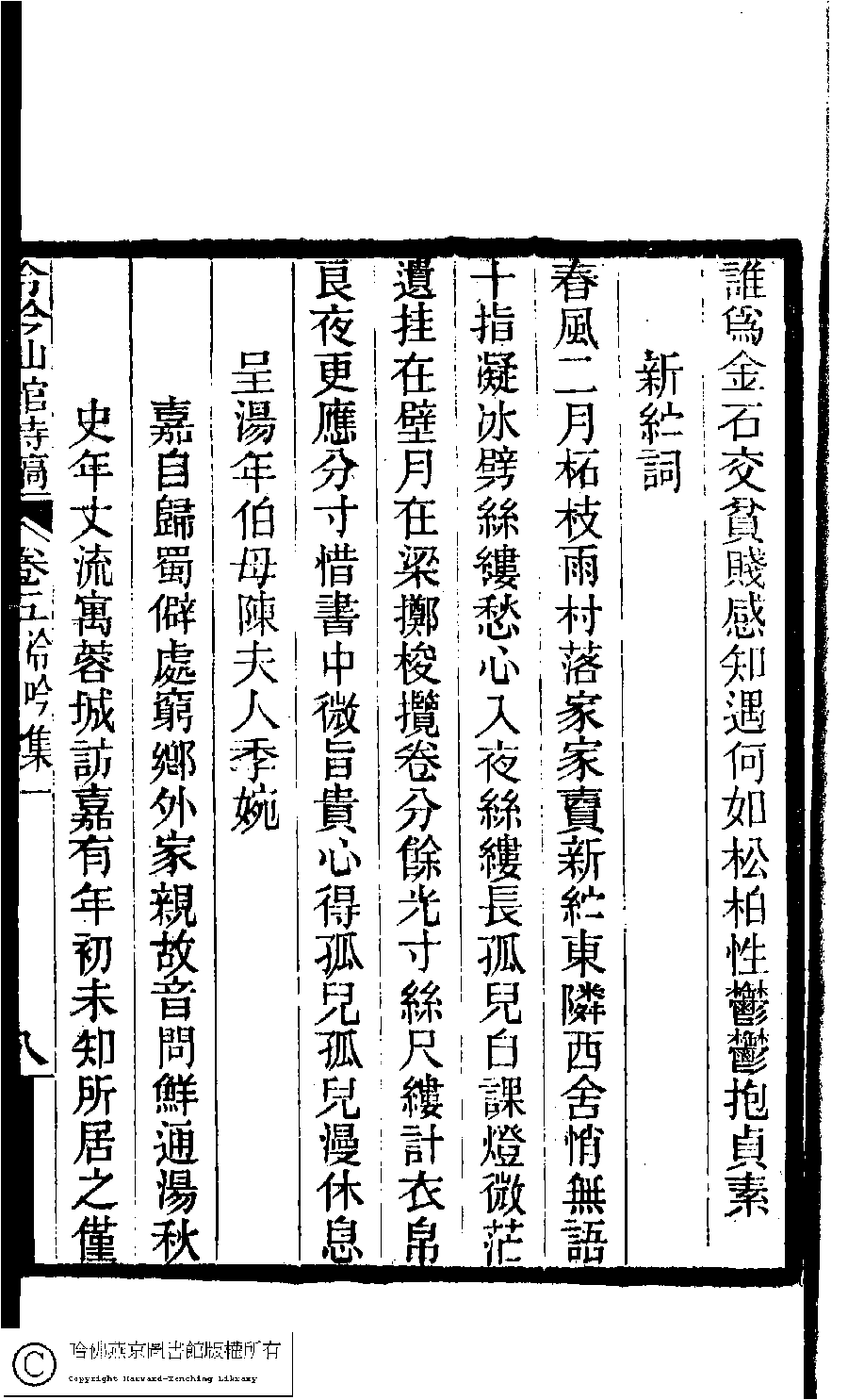 | (PRINT FRIENDLY VERSION) 冷吟仙舘詩稿﹕八卷﹐詩餘一卷﹐文存一卷(淸左錫嘉撰)。淸光緖辛卯(1891)刻本。 ![]() Page : 5.8a | click for larger image | Back |