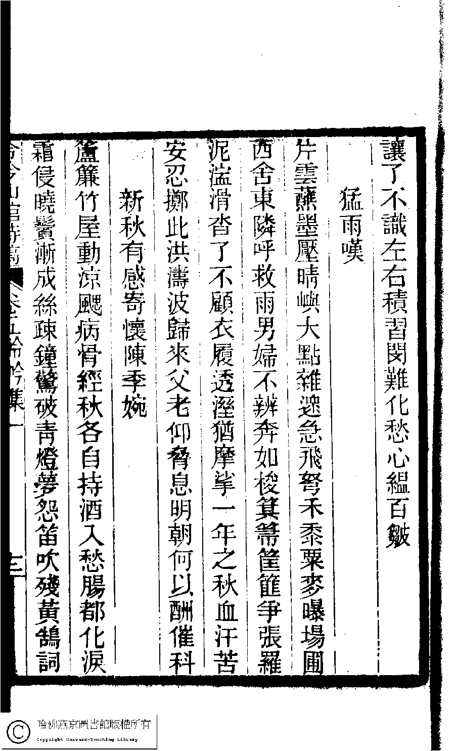 | (PRINT FRIENDLY VERSION) 冷吟仙舘詩稿﹕八卷﹐詩餘一卷﹐文存一卷(淸左錫嘉撰)。淸光緖辛卯(1891)刻本。 ![]() Page : 5.12a | click for larger image | Back |