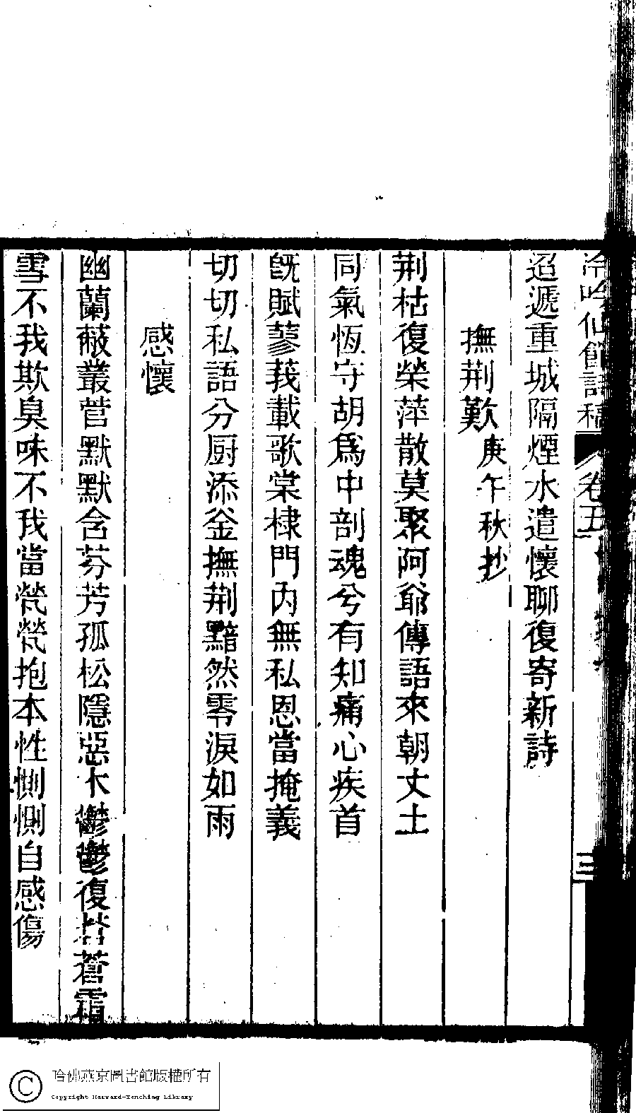 | (PRINT FRIENDLY VERSION) 冷吟仙舘詩稿﹕八卷﹐詩餘一卷﹐文存一卷(淸左錫嘉撰)。淸光緖辛卯(1891)刻本。 ![]() Page : 5.12b | click for larger image | Back |