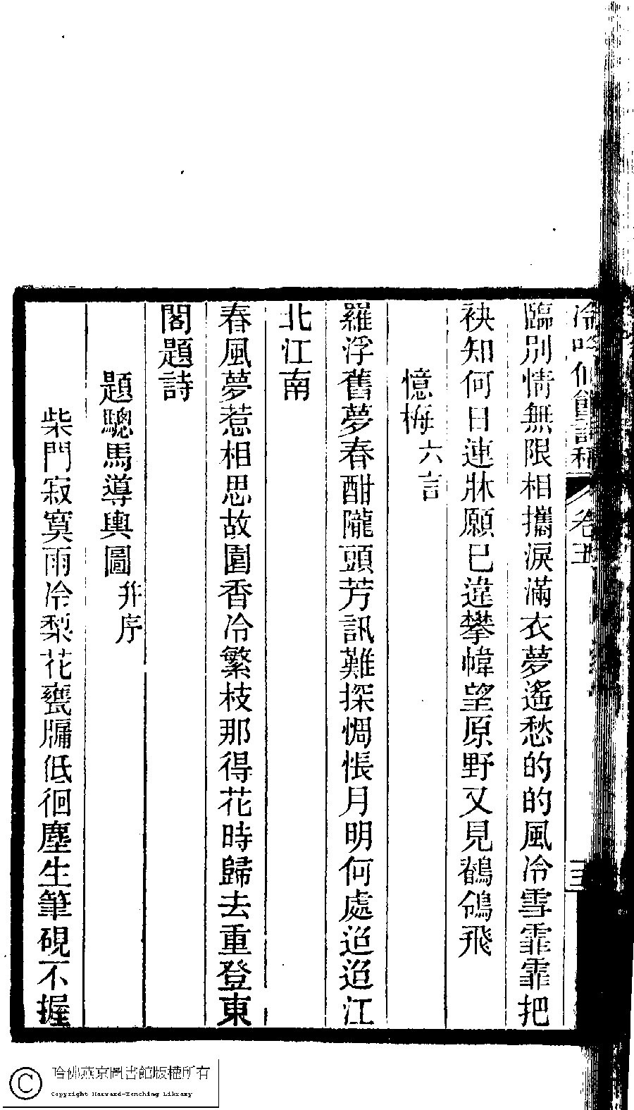 | (PRINT FRIENDLY VERSION) 冷吟仙舘詩稿﹕八卷﹐詩餘一卷﹐文存一卷(淸左錫嘉撰)。淸光緖辛卯(1891)刻本。 ![]() Page : 5.15b | click for larger image | Back |