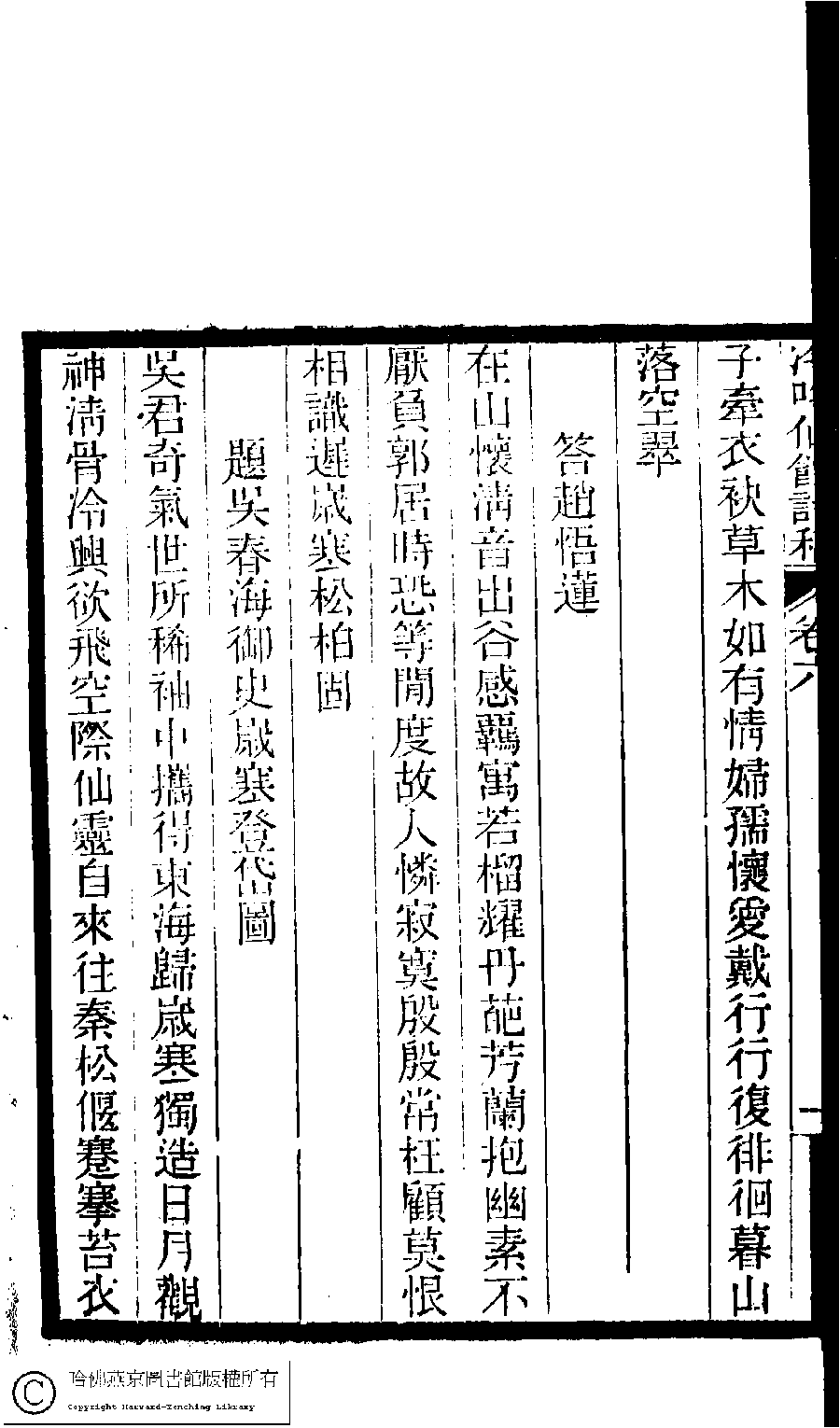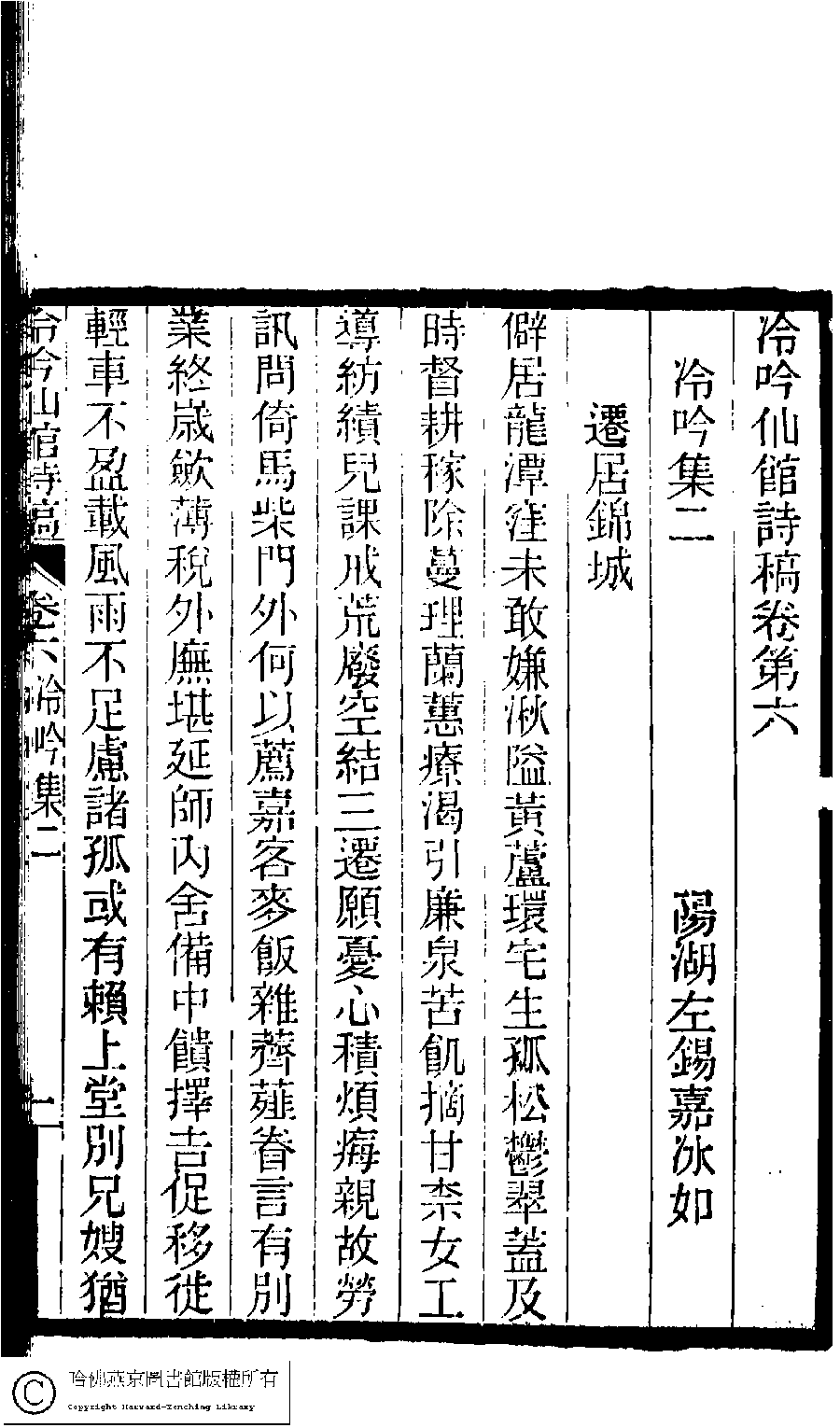 | (PRINT FRIENDLY VERSION) 冷吟仙舘詩稿﹕八卷﹐詩餘一卷﹐文存一卷(淸左錫嘉撰)。淸光緖辛卯(1891)刻本。 ![]() Page : 6.1b | click for larger image | 冷吟仙舘詩稿﹕八卷﹐詩餘一卷﹐文存一卷(淸左錫嘉撰)。淸光緖辛卯(1891)刻本。![]() Page : 6.1a | click for larger image | Back |