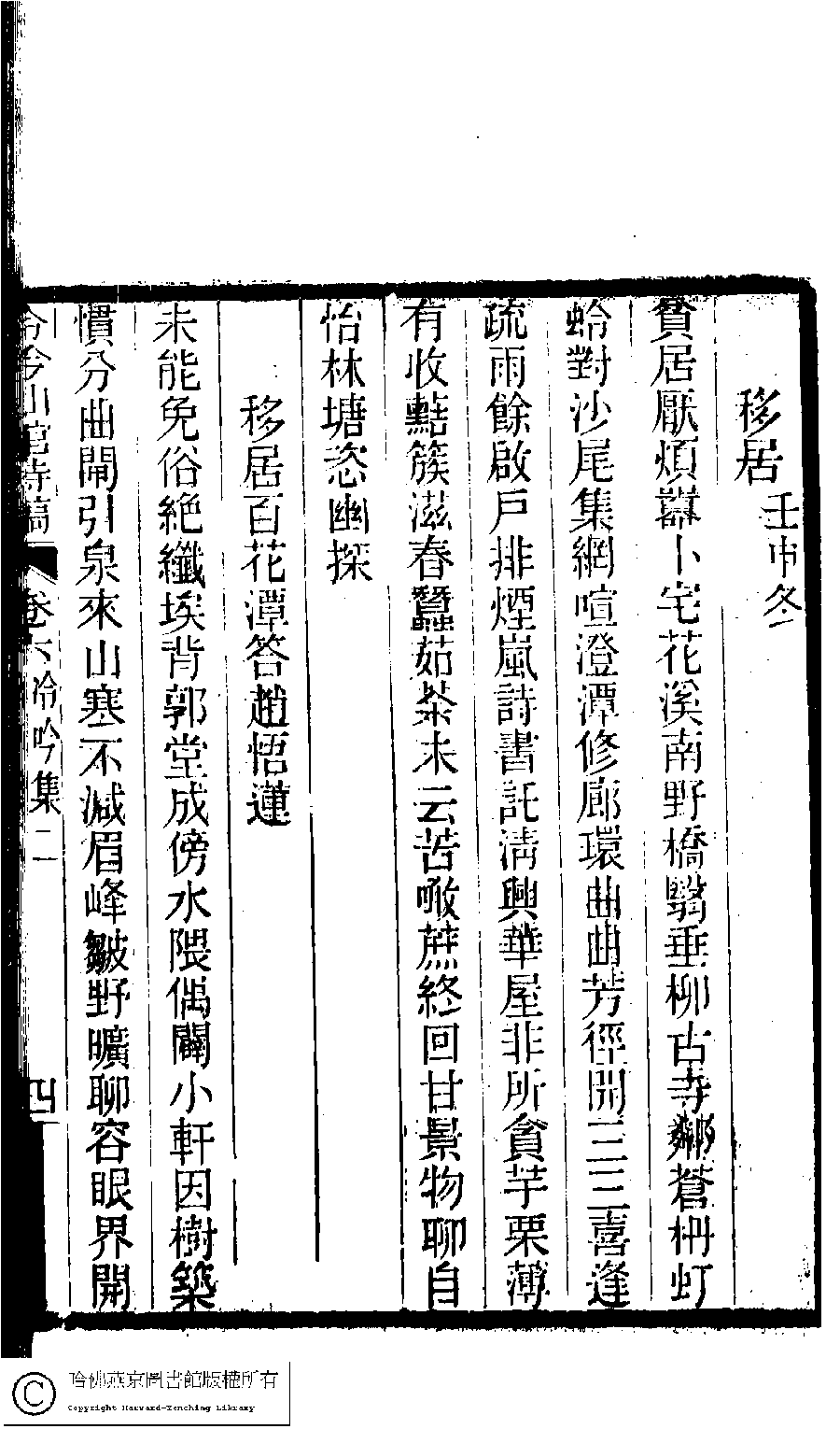 | (PRINT FRIENDLY VERSION) 冷吟仙舘詩稿﹕八卷﹐詩餘一卷﹐文存一卷(淸左錫嘉撰)。淸光緖辛卯(1891)刻本。 ![]() Page : 6.4b | click for larger image | 冷吟仙舘詩稿﹕八卷﹐詩餘一卷﹐文存一卷(淸左錫嘉撰)。淸光緖辛卯(1891)刻本。![]() Page : 6.4a | click for larger image | Back |