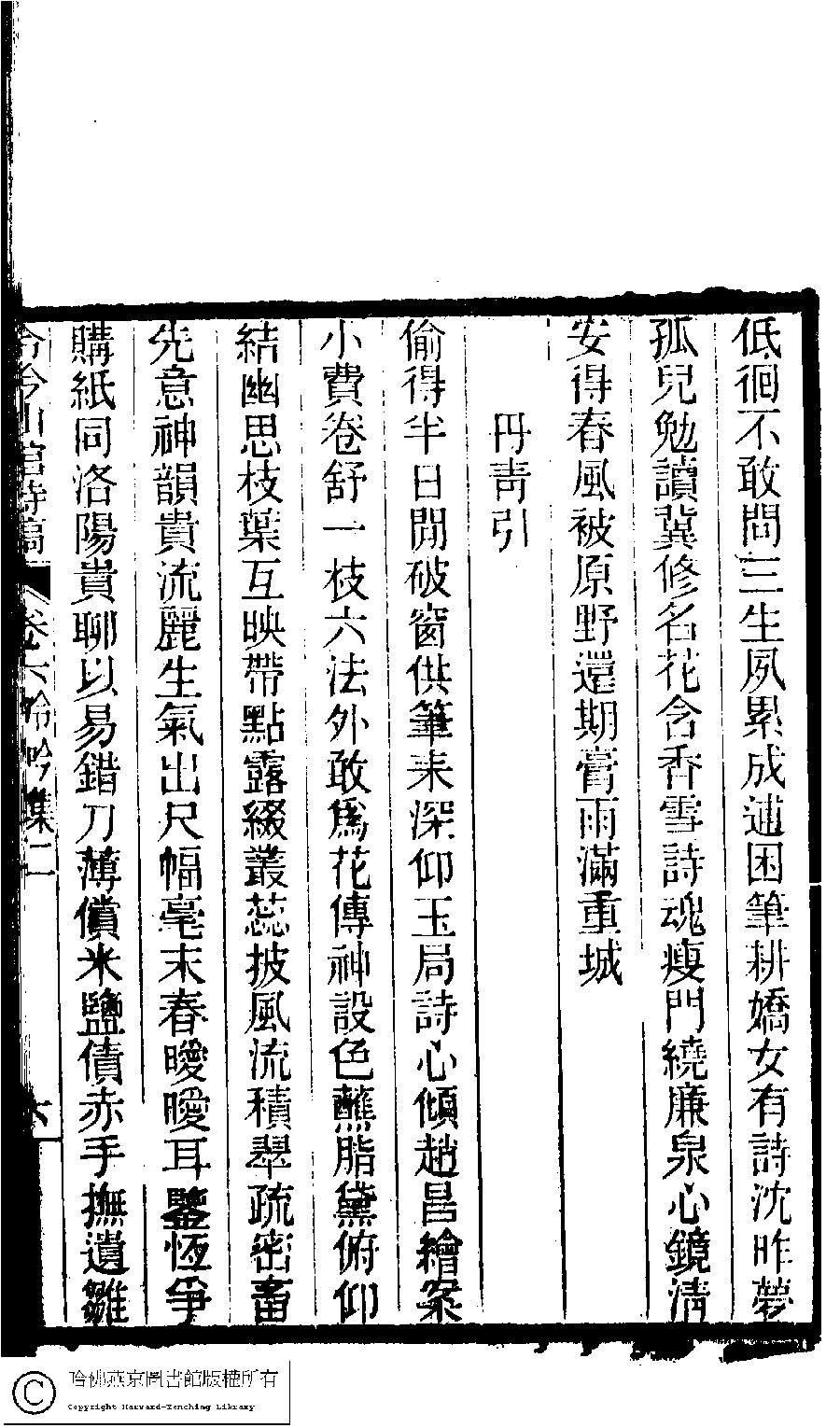 | (PRINT FRIENDLY VERSION) 冷吟仙舘詩稿﹕八卷﹐詩餘一卷﹐文存一卷(淸左錫嘉撰)。淸光緖辛卯(1891)刻本。 ![]() Page : 6.6b | click for larger image | 冷吟仙舘詩稿﹕八卷﹐詩餘一卷﹐文存一卷(淸左錫嘉撰)。淸光緖辛卯(1891)刻本。![]() Page : 6.6a | click for larger image | Back |