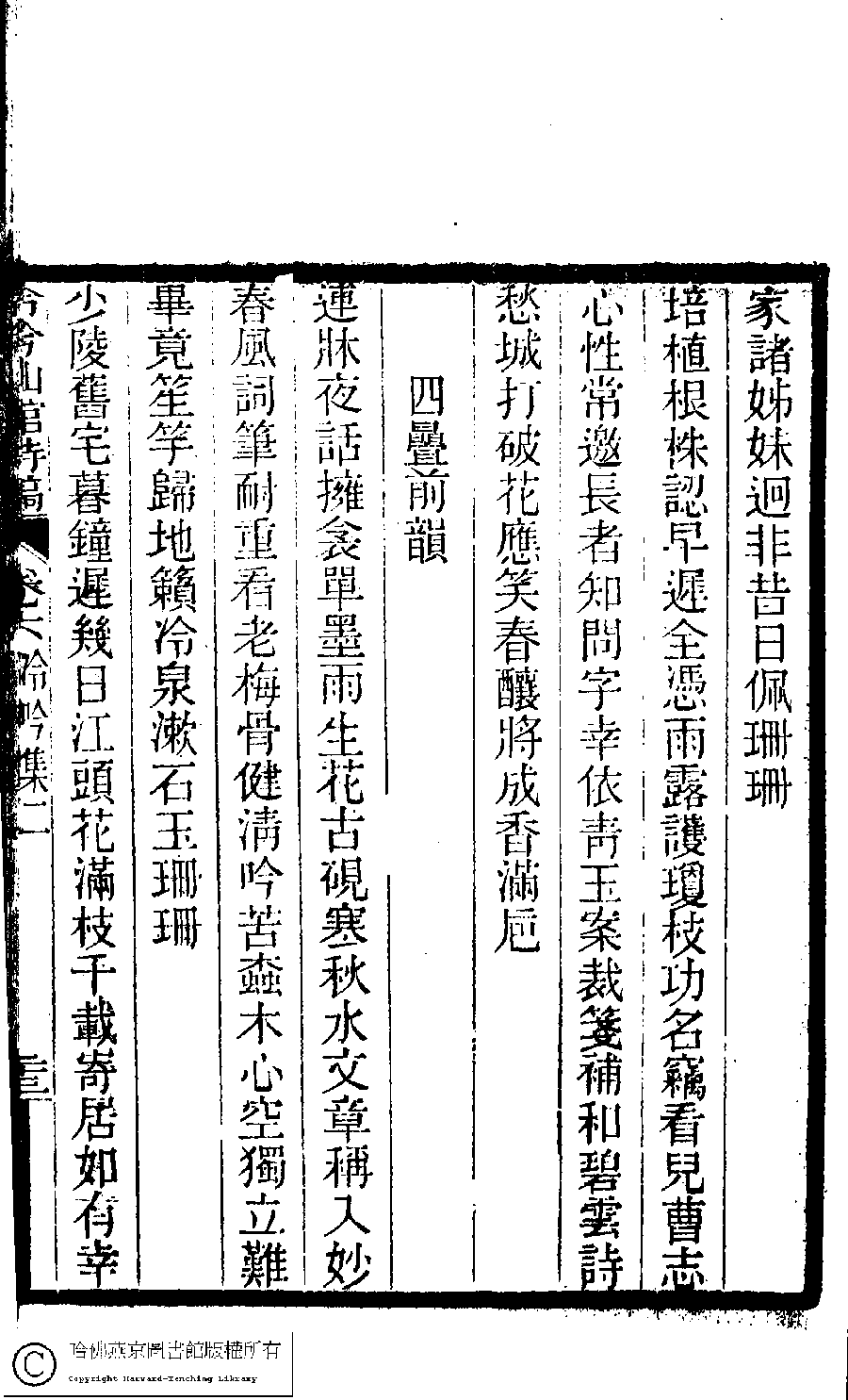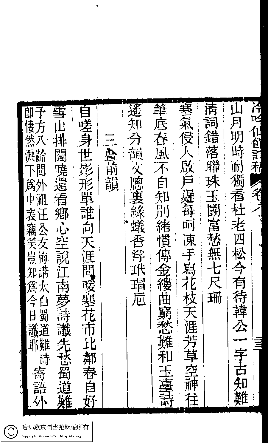 | (PRINT FRIENDLY VERSION) 冷吟仙舘詩稿﹕八卷﹐詩餘一卷﹐文存一卷(淸左錫嘉撰)。淸光緖辛卯(1891)刻本。 ![]() Page : 6.23a | click for larger image | 冷吟仙舘詩稿﹕八卷﹐詩餘一卷﹐文存一卷(淸左錫嘉撰)。淸光緖辛卯(1891)刻本。![]() Page : 6.22b | click for larger image | Back |