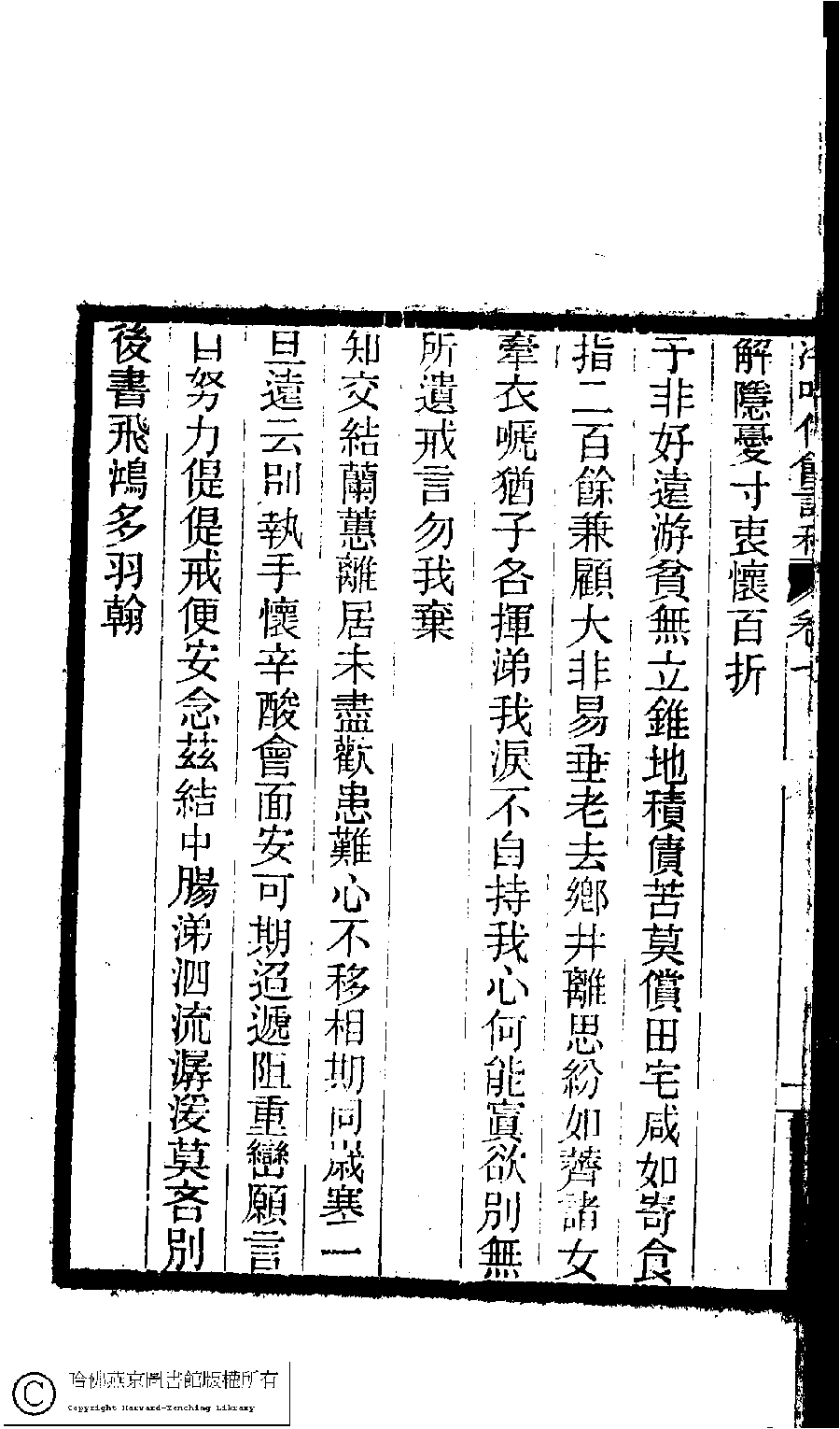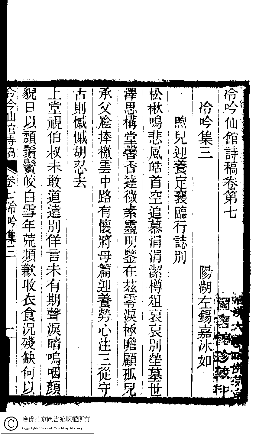 | (PRINT FRIENDLY VERSION) 冷吟仙舘詩稿﹕八卷﹐詩餘一卷﹐文存一卷(淸左錫嘉撰)。淸光緖辛卯(1891)刻本。 ![]() Page : 7.1b | click for larger image | 冷吟仙舘詩稿﹕八卷﹐詩餘一卷﹐文存一卷(淸左錫嘉撰)。淸光緖辛卯(1891)刻本。![]() Page : 7.1a | click for larger image | Back |