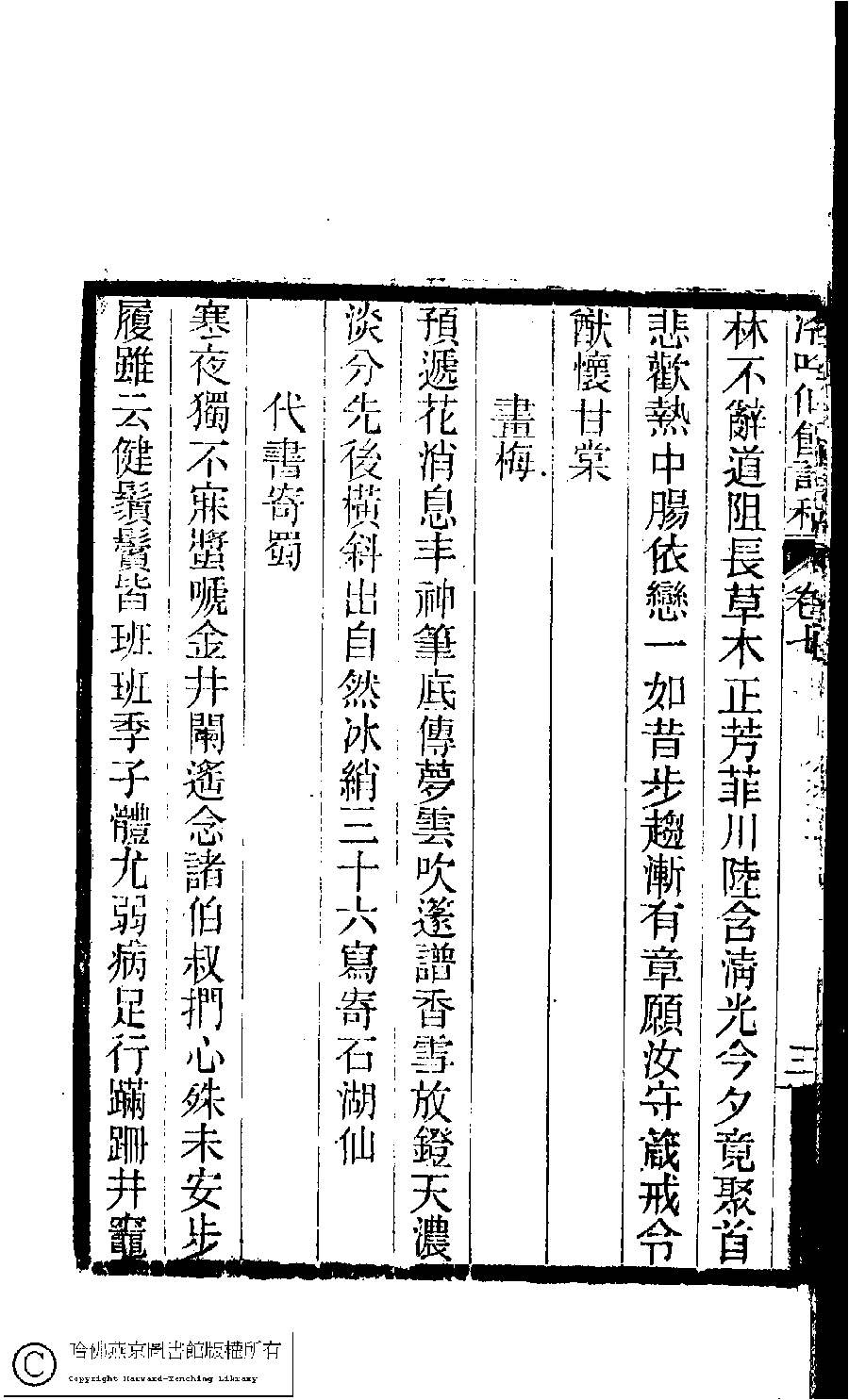 | (PRINT FRIENDLY VERSION) 冷吟仙舘詩稿﹕八卷﹐詩餘一卷﹐文存一卷(淸左錫嘉撰)。淸光緖辛卯(1891)刻本。 ![]() Page : 7.3b | click for larger image | 冷吟仙舘詩稿﹕八卷﹐詩餘一卷﹐文存一卷(淸左錫嘉撰)。淸光緖辛卯(1891)刻本。![]() Page : 7.3a | click for larger image | Back |