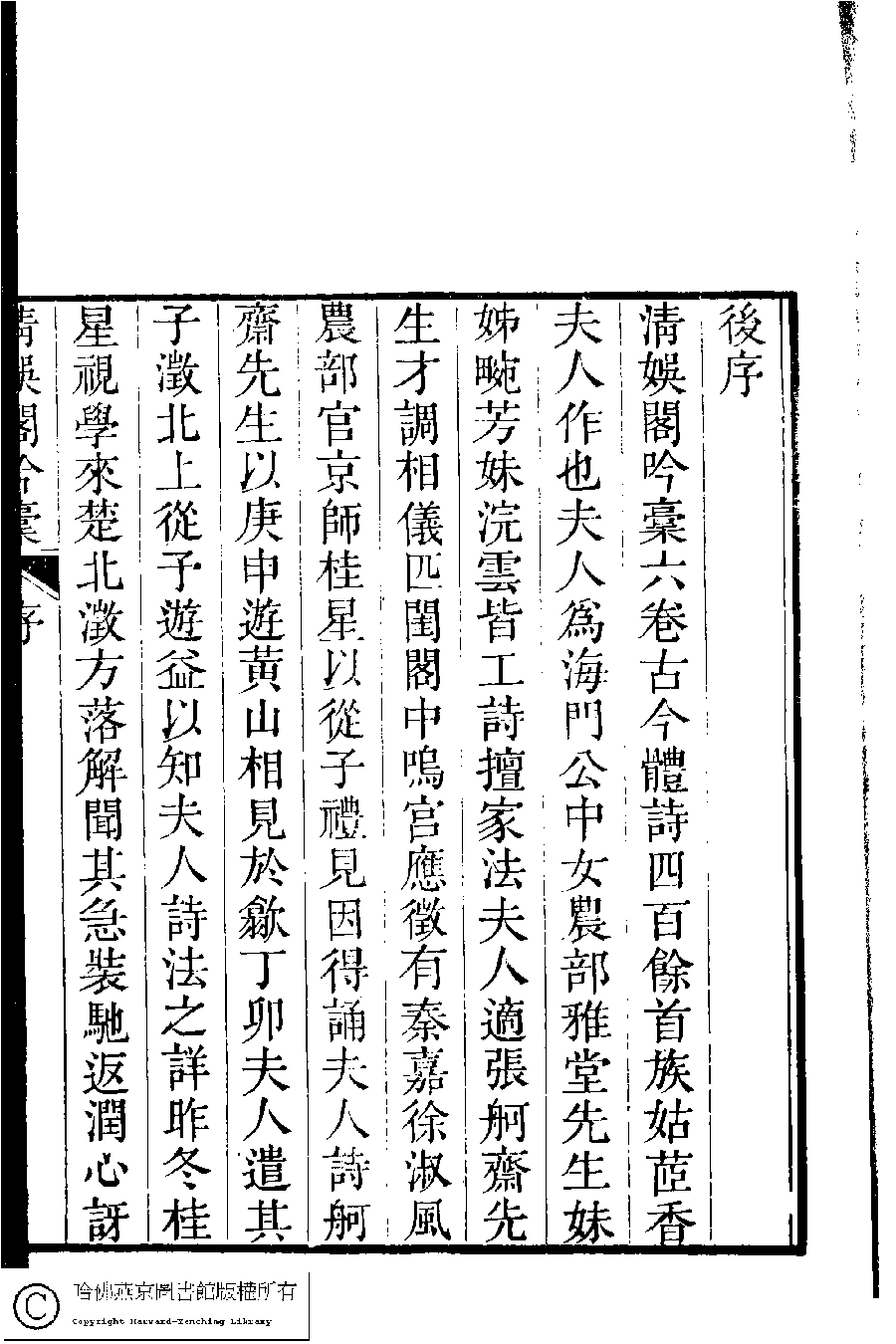 | (PRINT FRIENDLY VERSION) 清娛閣吟稾﹕六卷(清鮑之蕙撰)。嘉慶16年 [1811]刻本 ![]() Page : 後序.2b | click for larger image | 清娛閣吟稾﹕六卷(清鮑之蕙撰)。嘉慶16年 [1811]刻本![]() Page : 後序.2a | click for larger image | 清娛閣吟稾﹕六卷(清鮑之蕙撰)。嘉慶16年 [1811]刻本![]() Page : 後序.1b | click for larger image | 清娛閣吟稾﹕六卷(清鮑之蕙撰)。嘉慶16年 [1811]刻本![]() Page : 後序.1a | click for larger image | Back |