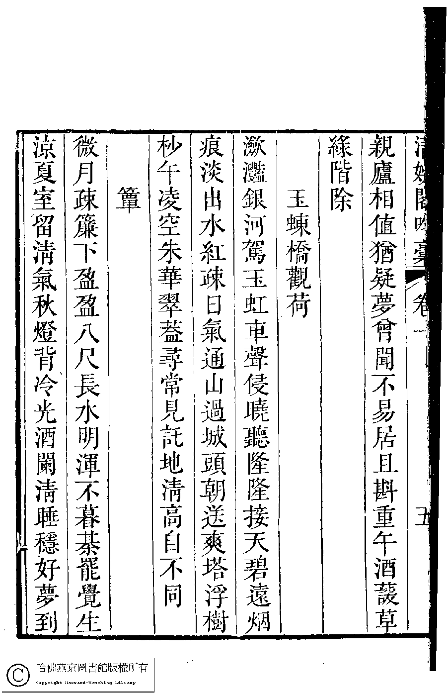 | (PRINT FRIENDLY VERSION) 清娛閣吟稾﹕六卷(清鮑之蕙撰)。嘉慶16年 [1811]刻本 ![]() Page : 1.5b | click for larger image | Back |