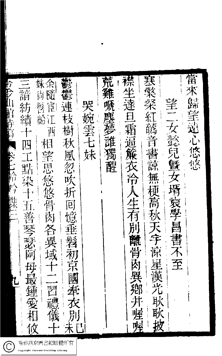 | (PRINT FRIENDLY VERSION) 冷吟仙舘詩稿﹕八卷﹐詩餘一卷﹐文存一卷(淸左錫嘉撰)。淸光緖辛卯(1891)刻本。 ![]() Page : 7.9a | click for larger image | Back |