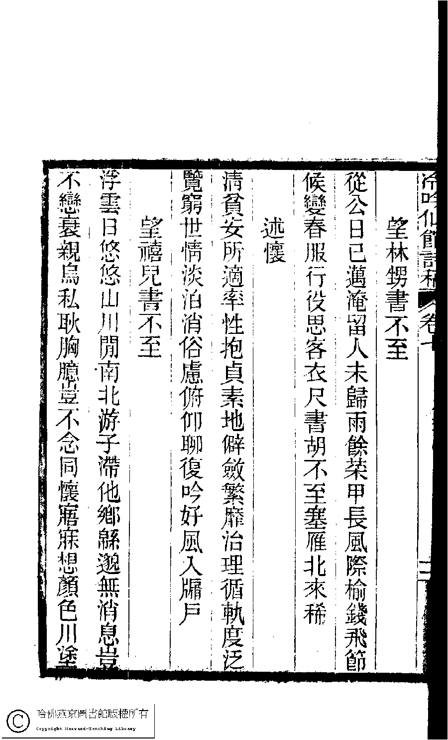 | (PRINT FRIENDLY VERSION) 冷吟仙舘詩稿﹕八卷﹐詩餘一卷﹐文存一卷(淸左錫嘉撰)。淸光緖辛卯(1891)刻本。 ![]() Page : 7.12a | click for larger image | 冷吟仙舘詩稿﹕八卷﹐詩餘一卷﹐文存一卷(淸左錫嘉撰)。淸光緖辛卯(1891)刻本。![]() Page : 7.11b | click for larger image | Back |