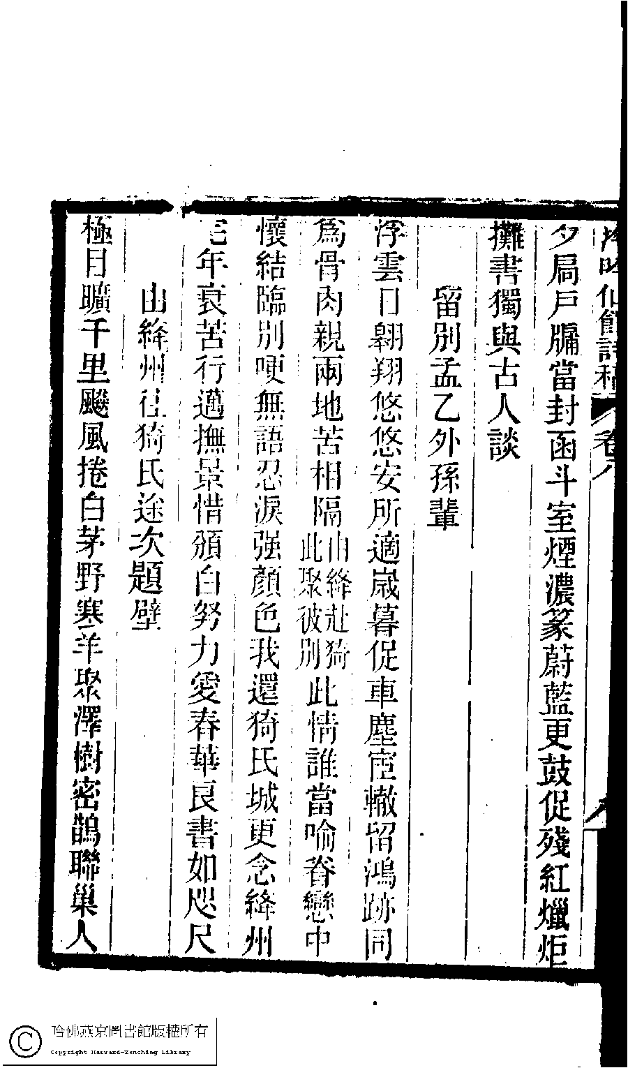 | (PRINT FRIENDLY VERSION) 冷吟仙舘詩稿﹕八卷﹐詩餘一卷﹐文存一卷(淸左錫嘉撰)。淸光緖辛卯(1891)刻本。 ![]() Page : 8.8b | click for larger image | 冷吟仙舘詩稿﹕八卷﹐詩餘一卷﹐文存一卷(淸左錫嘉撰)。淸光緖辛卯(1891)刻本。![]() Page : 8.8a | click for larger image | Back |