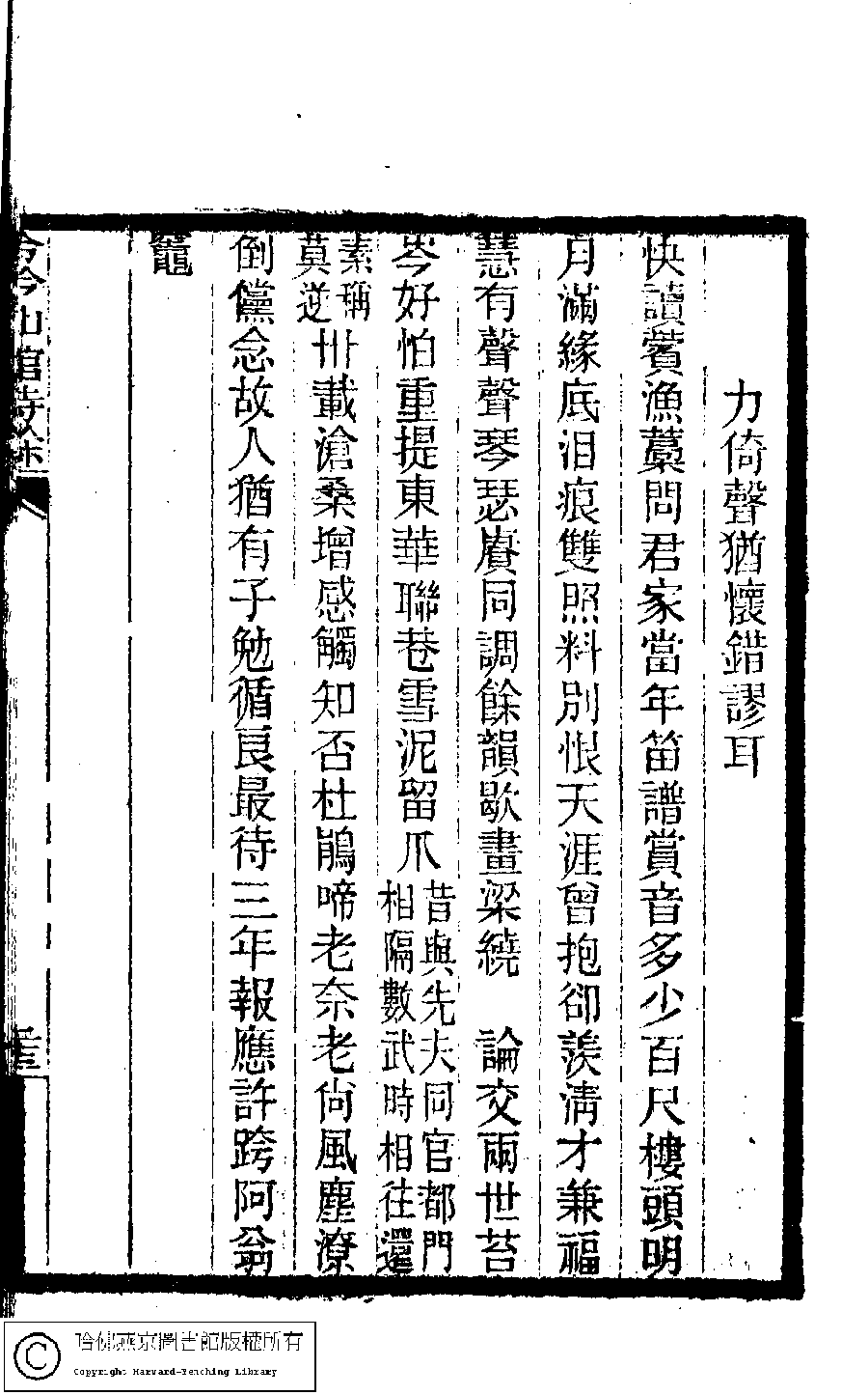 | (PRINT FRIENDLY VERSION) 冷吟仙舘詩稿﹕八卷﹐詩餘一卷﹐文存一卷(淸左錫嘉撰)。淸光緖辛卯(1891)刻本。 ![]() Page : 詩餘.23b | click for larger image | 冷吟仙舘詩稿﹕八卷﹐詩餘一卷﹐文存一卷(淸左錫嘉撰)。淸光緖辛卯(1891)刻本。![]() Page : 詩餘.23a | click for larger image | 冷吟仙舘詩稿﹕八卷﹐詩餘一卷﹐文存一卷(淸左錫嘉撰)。淸光緖辛卯(1891)刻本。![]() Page : 詩餘.22b | click for larger image | Back |