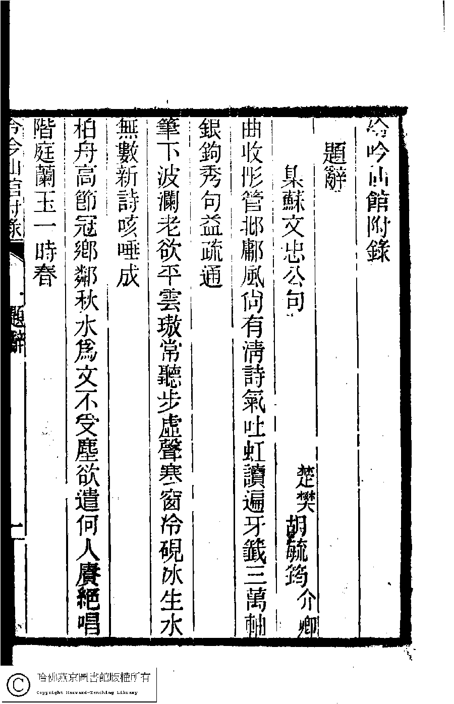 | (PRINT FRIENDLY VERSION) 冷吟仙舘詩稿﹕八卷﹐詩餘一卷﹐文存一卷(淸左錫嘉撰)。淸光緖辛卯(1891)刻本。 ![]() Page : 附錄.1b | click for larger image | 冷吟仙舘詩稿﹕八卷﹐詩餘一卷﹐文存一卷(淸左錫嘉撰)。淸光緖辛卯(1891)刻本。![]() Page : 附錄.1a | click for larger image | Back |