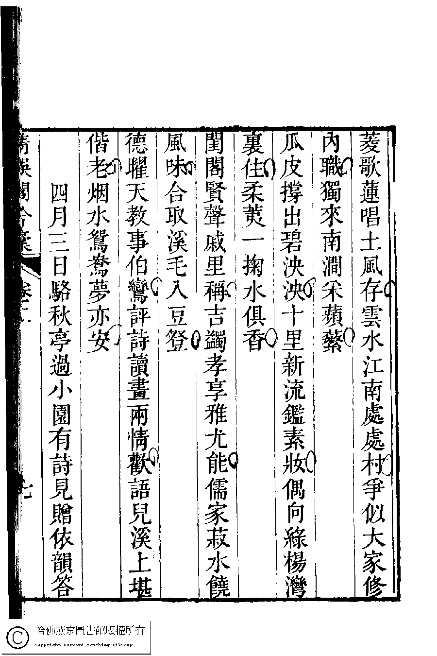 | (PRINT FRIENDLY VERSION) 清娛閣吟稾﹕六卷(清鮑之蕙撰)。嘉慶16年 [1811]刻本 ![]() Page : 2.7a | click for larger image | 清娛閣吟稾﹕六卷(清鮑之蕙撰)。嘉慶16年 [1811]刻本![]() Page : 2.6b | click for larger image | Back |