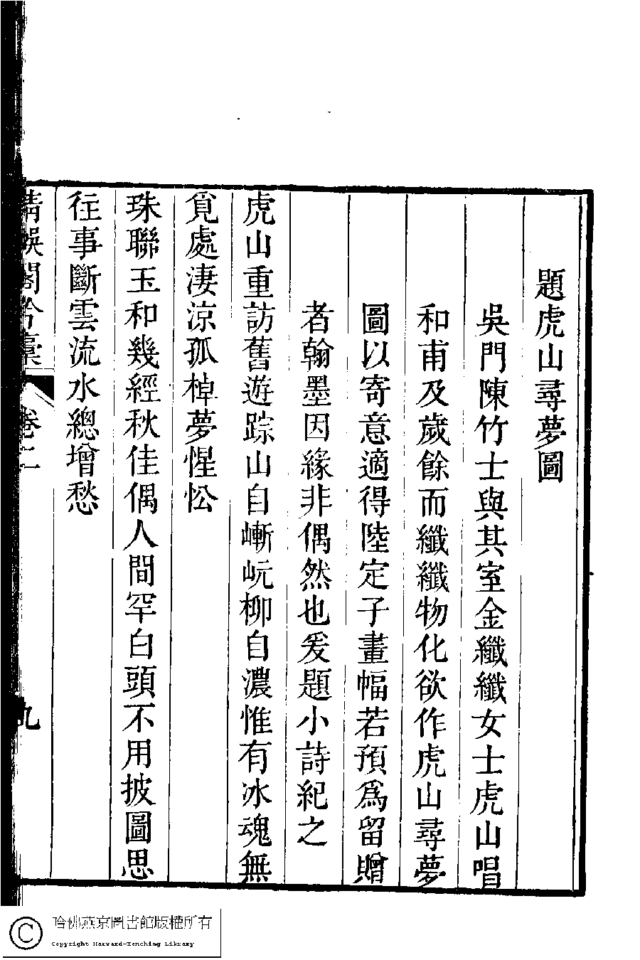 | (PRINT FRIENDLY VERSION) 清娛閣吟稾﹕六卷(清鮑之蕙撰)。嘉慶16年 [1811]刻本 ![]() Page : 2.9a | click for larger image | Back |