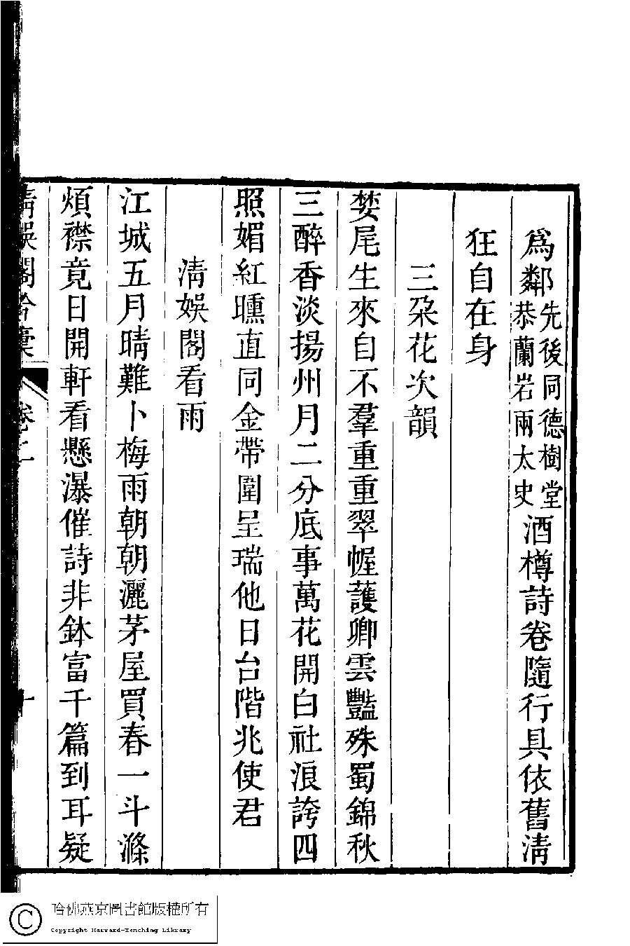 | (PRINT FRIENDLY VERSION) 清娛閣吟稾﹕六卷(清鮑之蕙撰)。嘉慶16年 [1811]刻本 ![]() Page : 2.10a | click for larger image | 清娛閣吟稾﹕六卷(清鮑之蕙撰)。嘉慶16年 [1811]刻本![]() Page : 2.9b | click for larger image | Back |