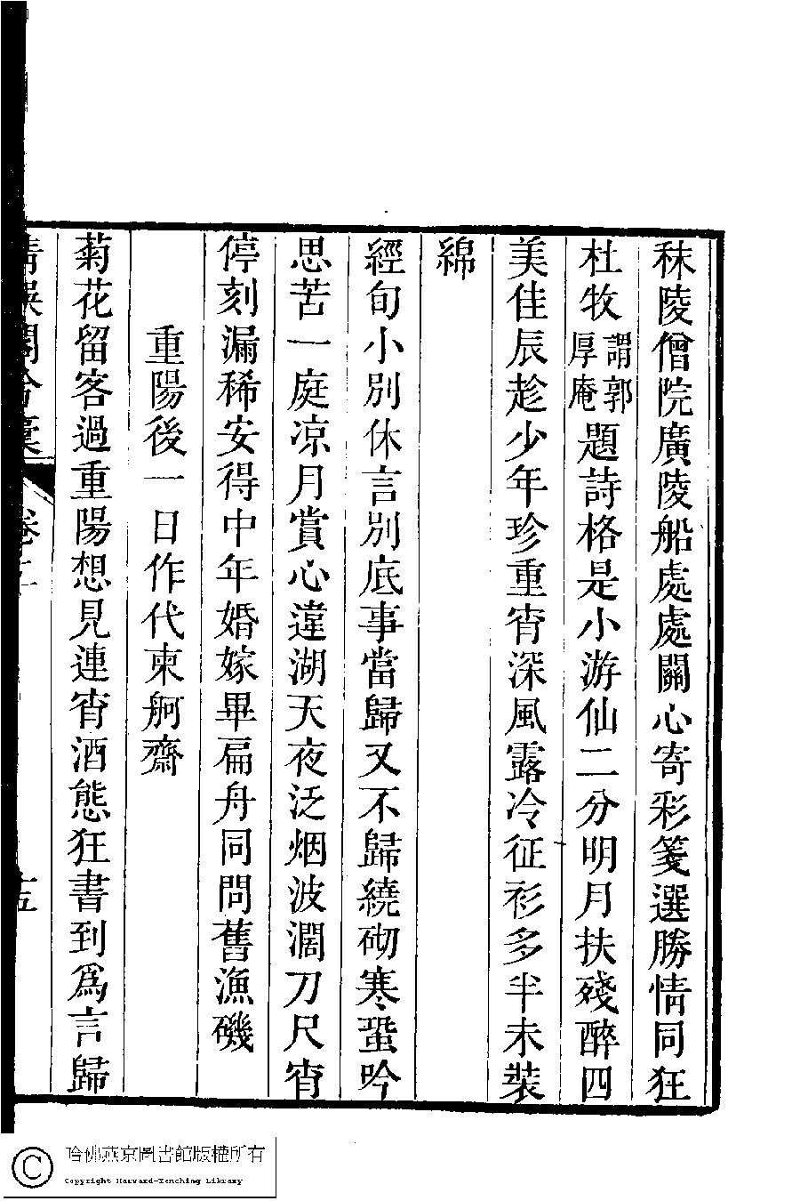 | (PRINT FRIENDLY VERSION) 清娛閣吟稾﹕六卷(清鮑之蕙撰)。嘉慶16年 [1811]刻本 ![]() Page : 2.15a | click for larger image | 清娛閣吟稾﹕六卷(清鮑之蕙撰)。嘉慶16年 [1811]刻本![]() Page : 2.14b | click for larger image | Back |